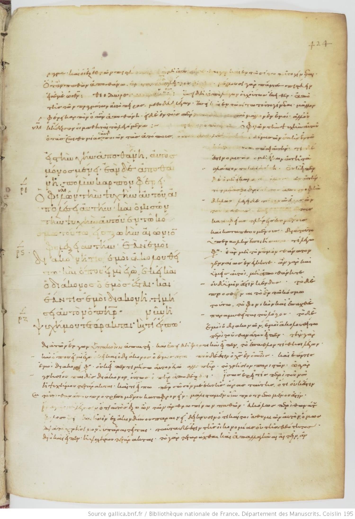 Tenth-century minuscule of the Gospels with commentary on parchment; 469 leaves, 1 column, varying number of lines per column. Images are made available by the Bilbiothèque Nationale. For recent images, please visit BNF Gallica.