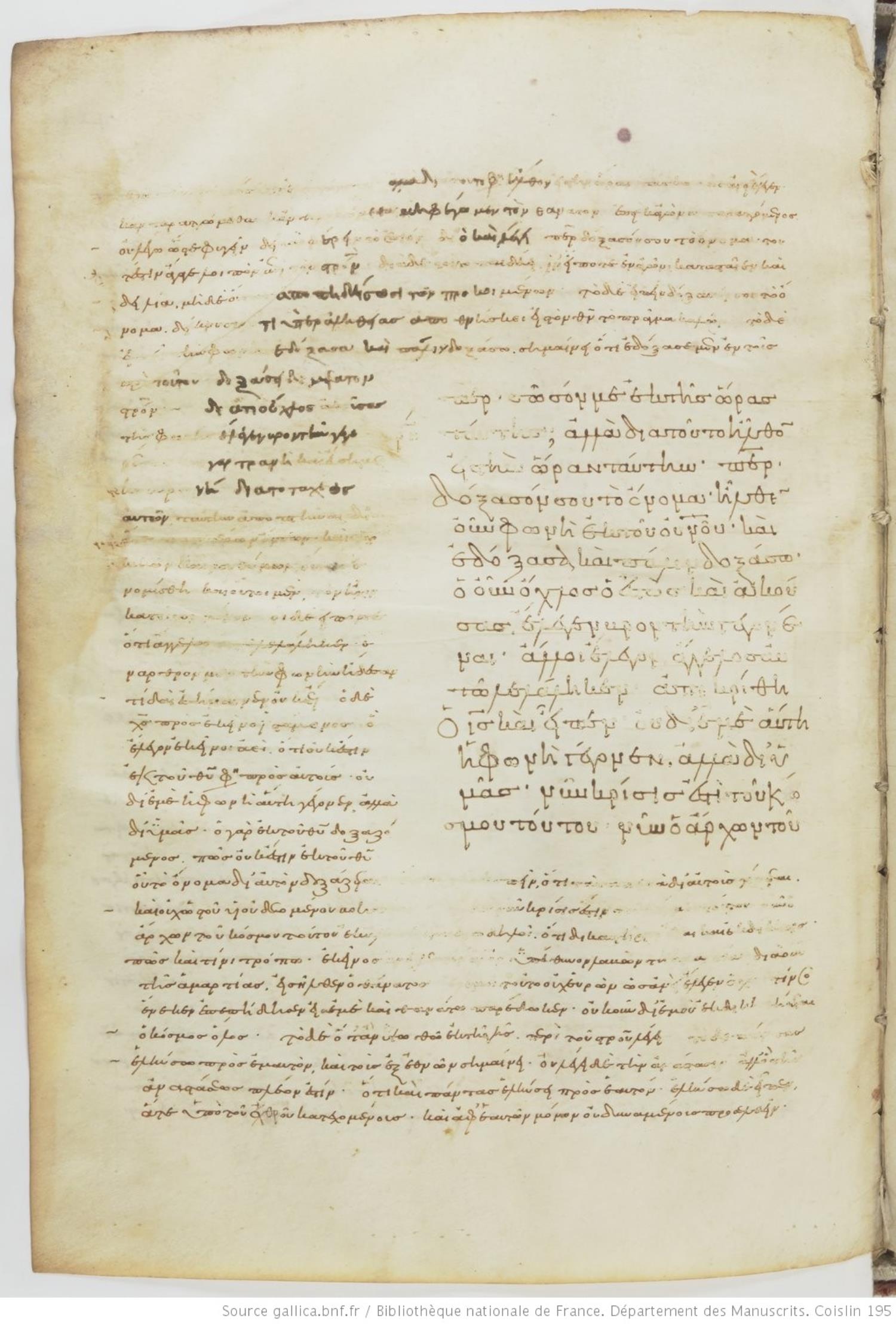 Tenth-century minuscule of the Gospels with commentary on parchment; 469 leaves, 1 column, varying number of lines per column. Images are made available by the Bilbiothèque Nationale. For recent images, please visit BNF Gallica.