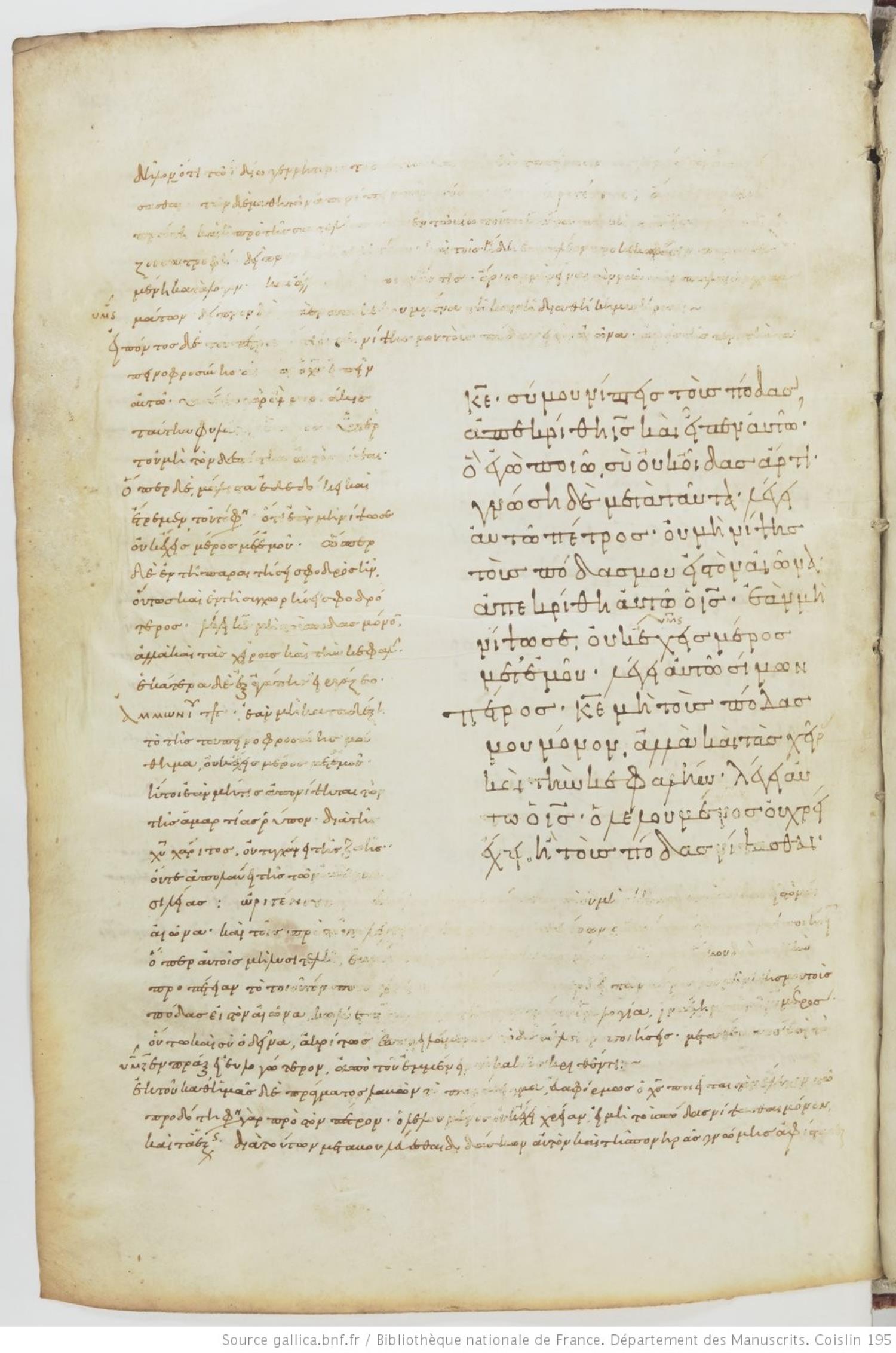 Tenth-century minuscule of the Gospels with commentary on parchment; 469 leaves, 1 column, varying number of lines per column. Images are made available by the Bilbiothèque Nationale. For recent images, please visit BNF Gallica.