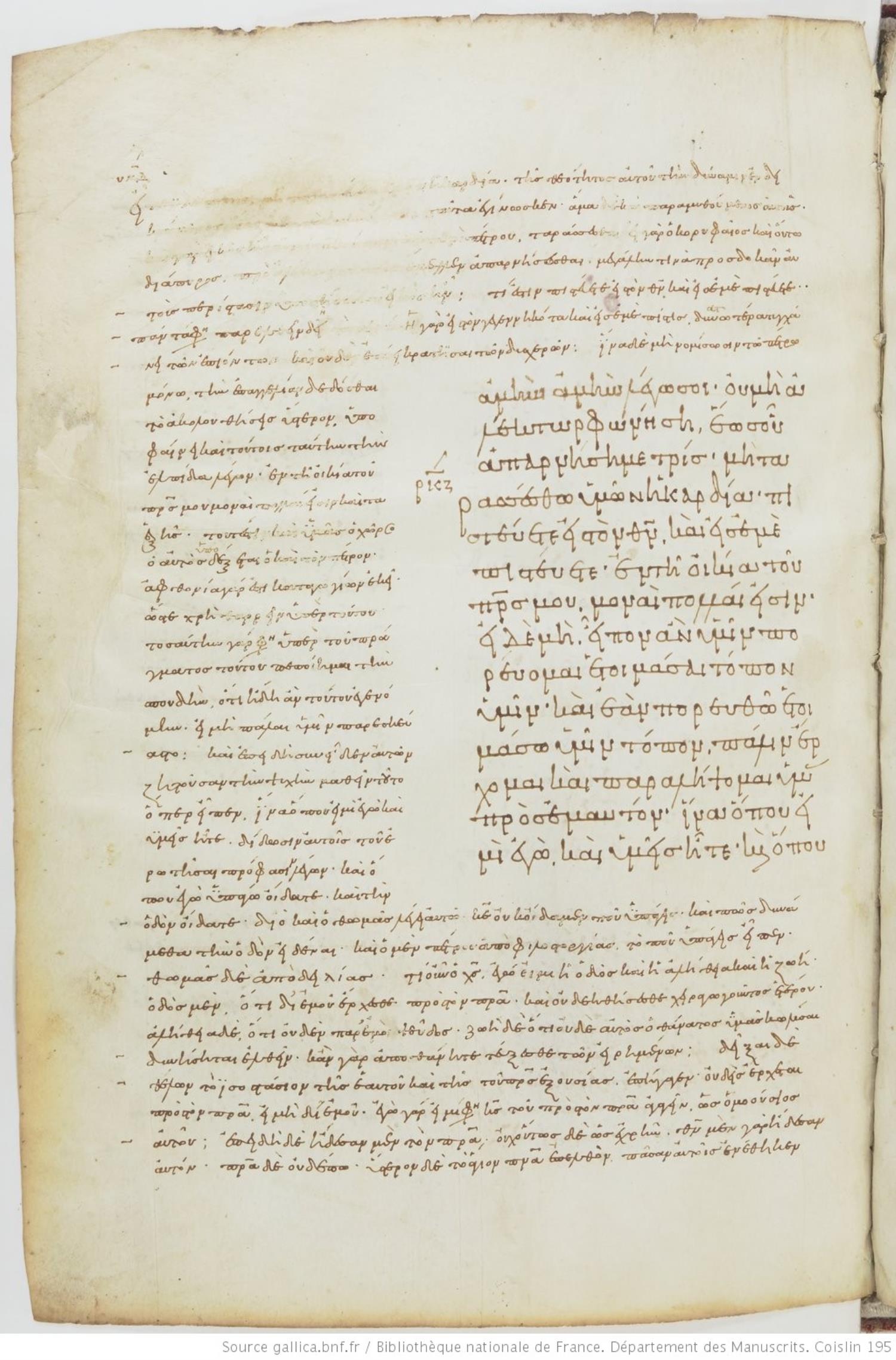 Tenth-century minuscule of the Gospels with commentary on parchment; 469 leaves, 1 column, varying number of lines per column. Images are made available by the Bilbiothèque Nationale. For recent images, please visit BNF Gallica.