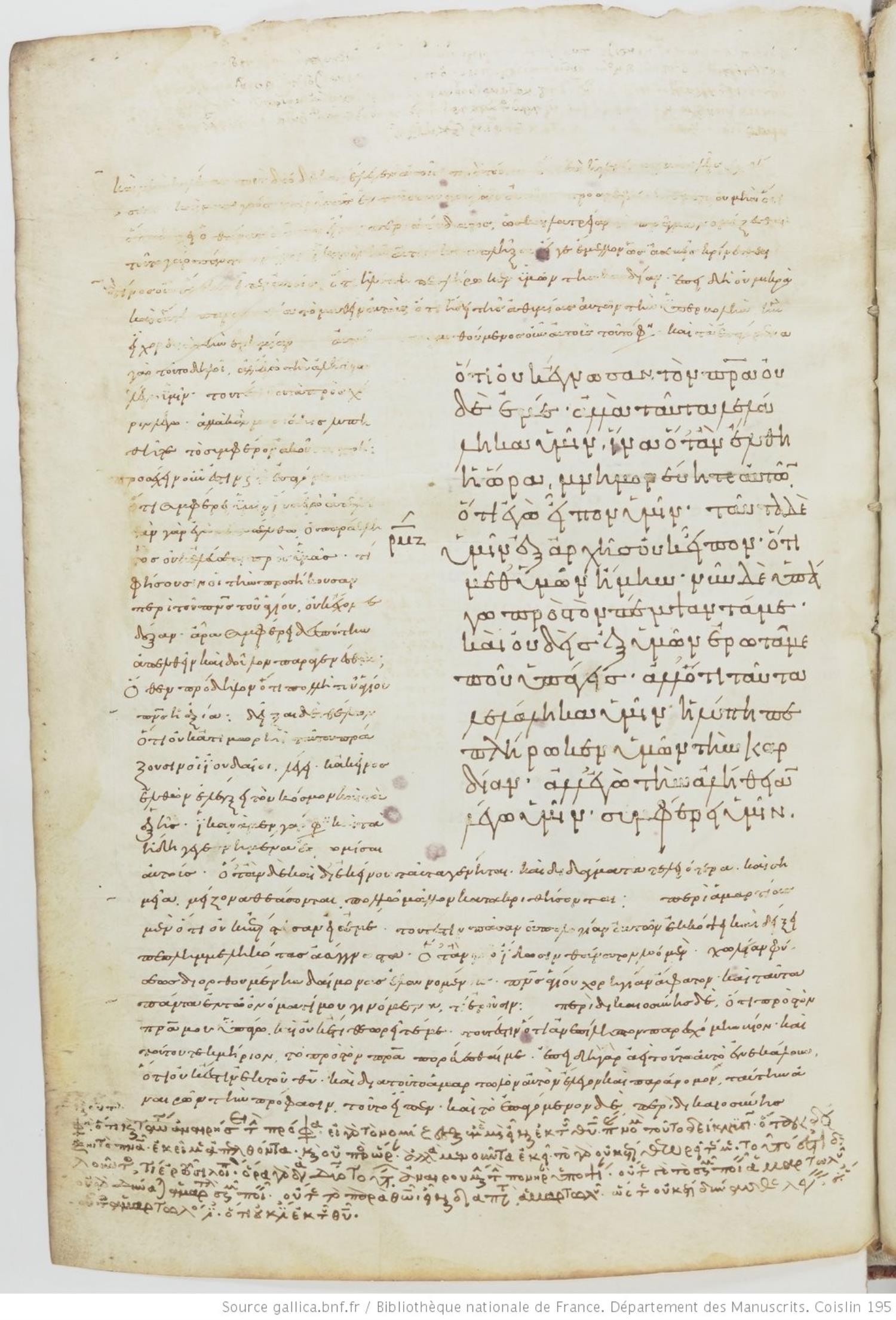 Tenth-century minuscule of the Gospels with commentary on parchment; 469 leaves, 1 column, varying number of lines per column. Images are made available by the Bilbiothèque Nationale. For recent images, please visit BNF Gallica.
