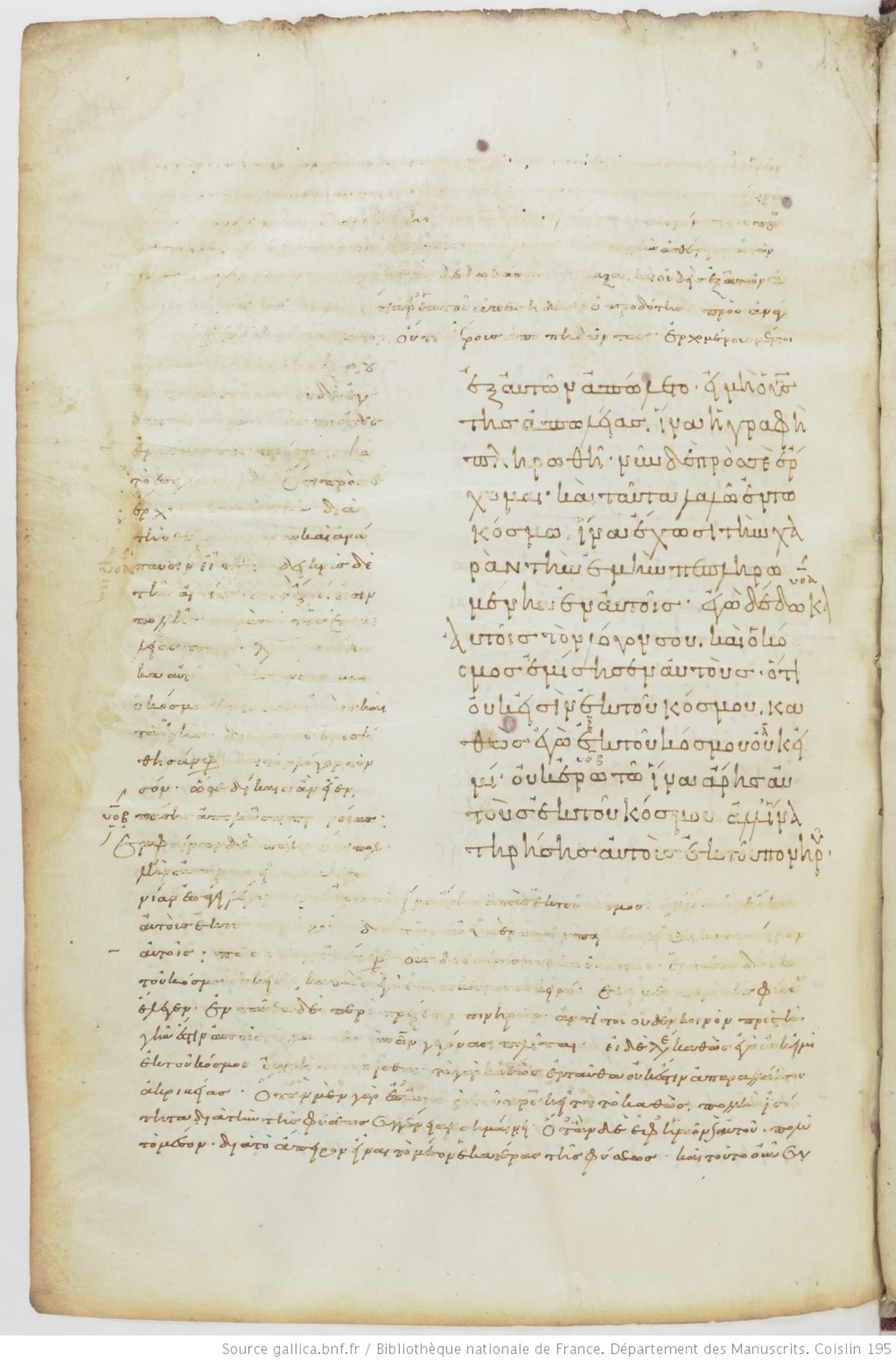 Tenth-century minuscule of the Gospels with commentary on parchment; 469 leaves, 1 column, varying number of lines per column. Images are made available by the Bilbiothèque Nationale. For recent images, please visit BNF Gallica.