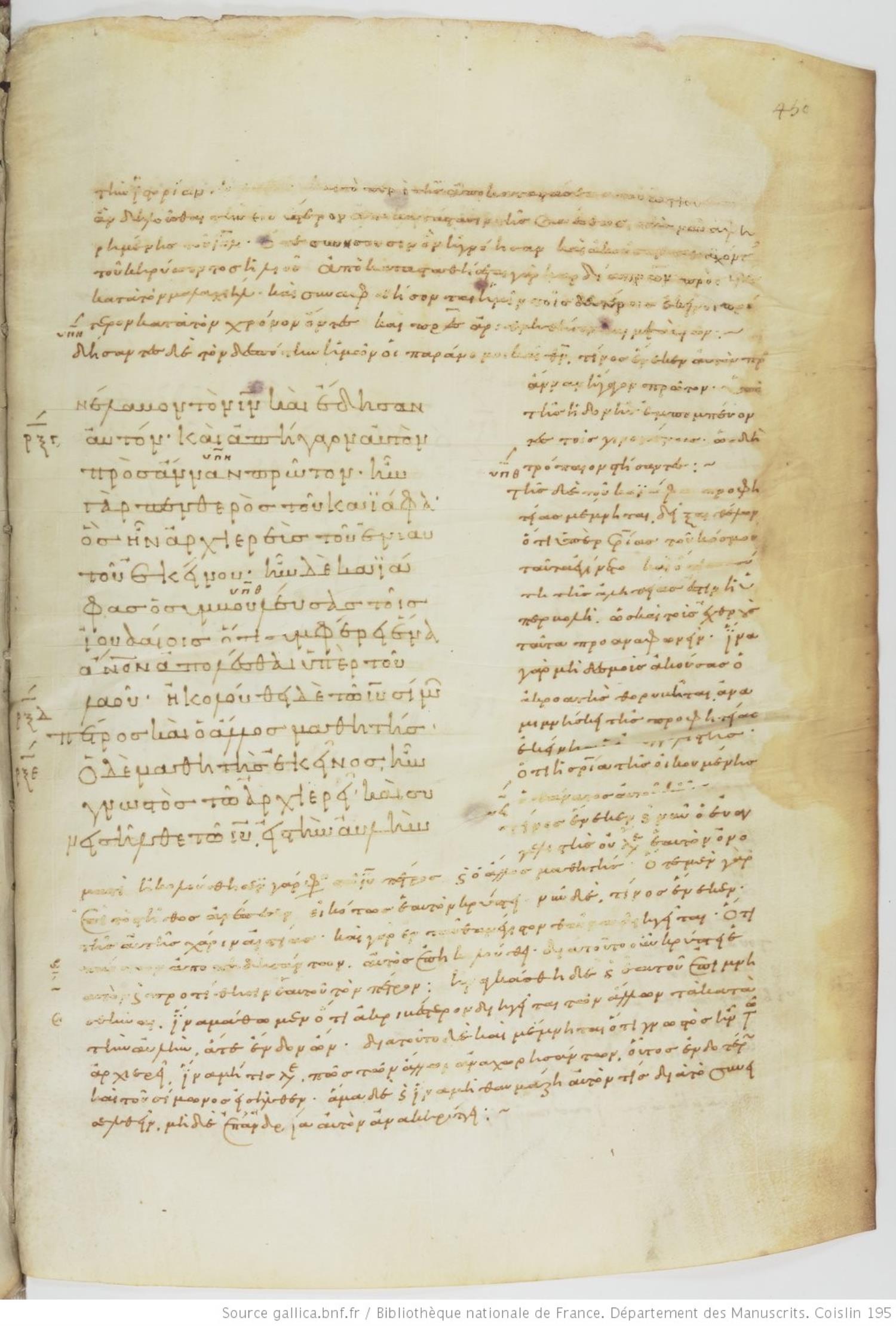 Tenth-century minuscule of the Gospels with commentary on parchment; 469 leaves, 1 column, varying number of lines per column. Images are made available by the Bilbiothèque Nationale. For recent images, please visit BNF Gallica.