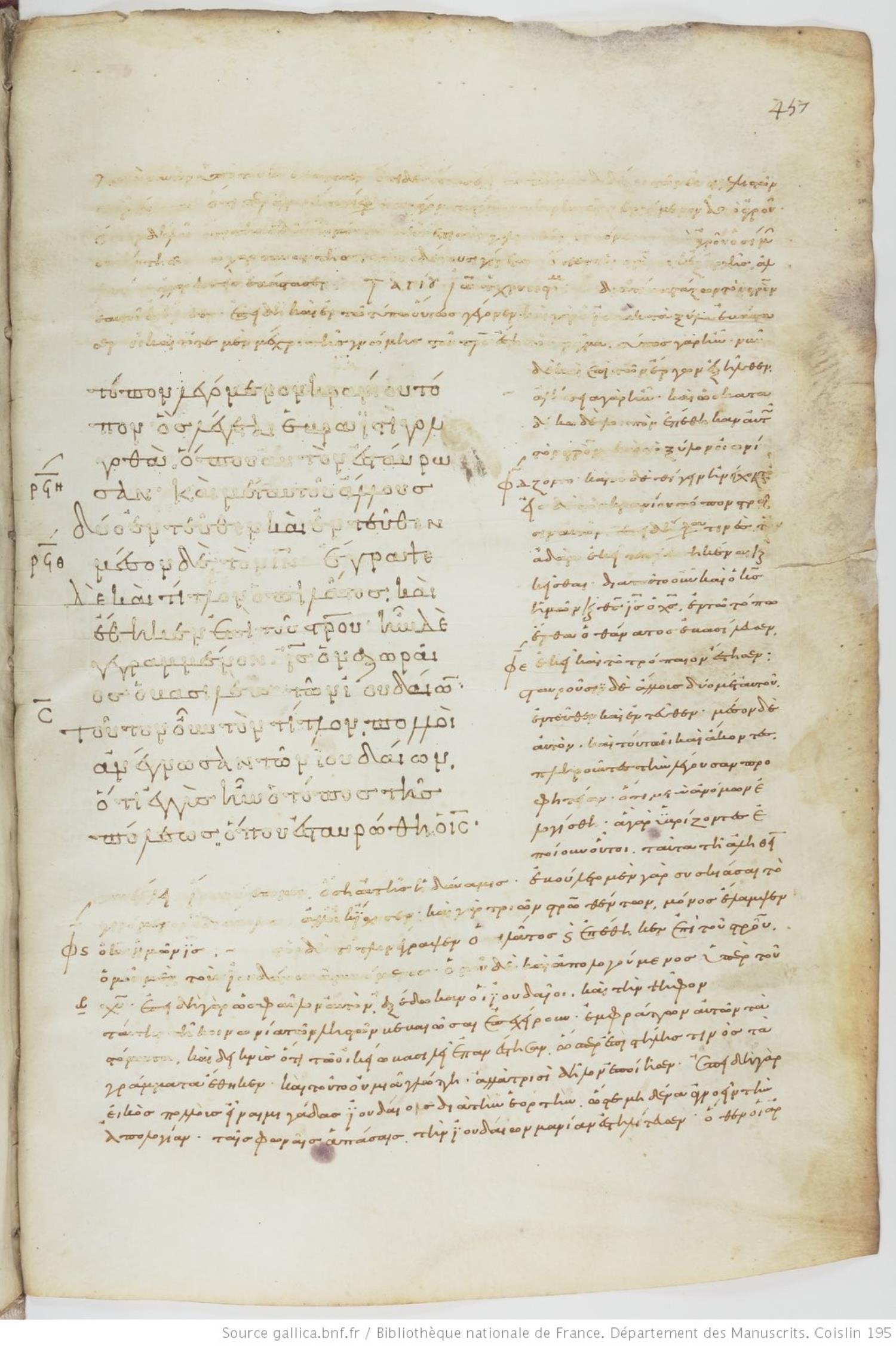 Tenth-century minuscule of the Gospels with commentary on parchment; 469 leaves, 1 column, varying number of lines per column. Images are made available by the Bilbiothèque Nationale. For recent images, please visit BNF Gallica.