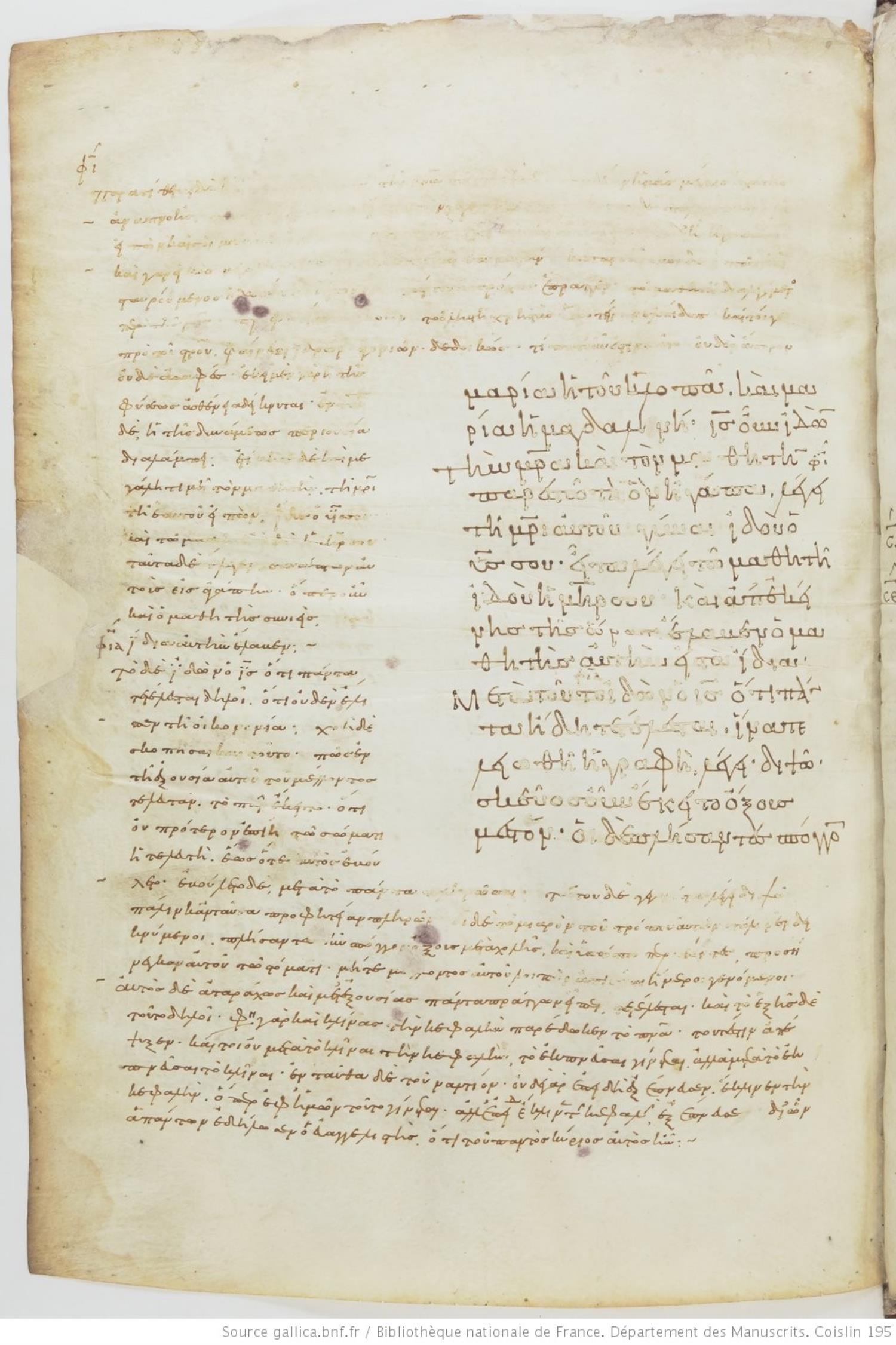 Tenth-century minuscule of the Gospels with commentary on parchment; 469 leaves, 1 column, varying number of lines per column. Images are made available by the Bilbiothèque Nationale. For recent images, please visit BNF Gallica.