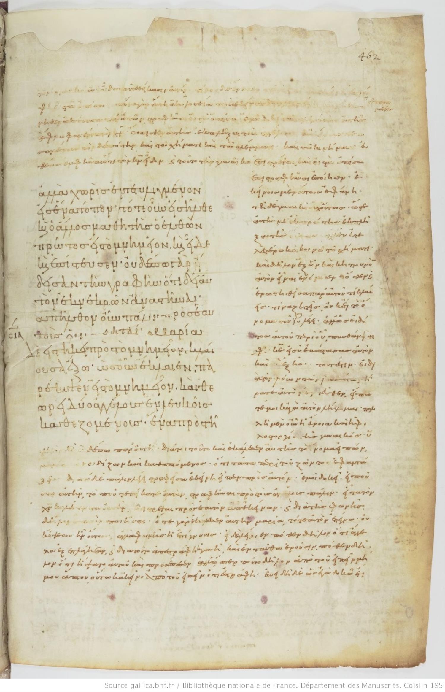 Tenth-century minuscule of the Gospels with commentary on parchment; 469 leaves, 1 column, varying number of lines per column. Images are made available by the Bilbiothèque Nationale. For recent images, please visit BNF Gallica.