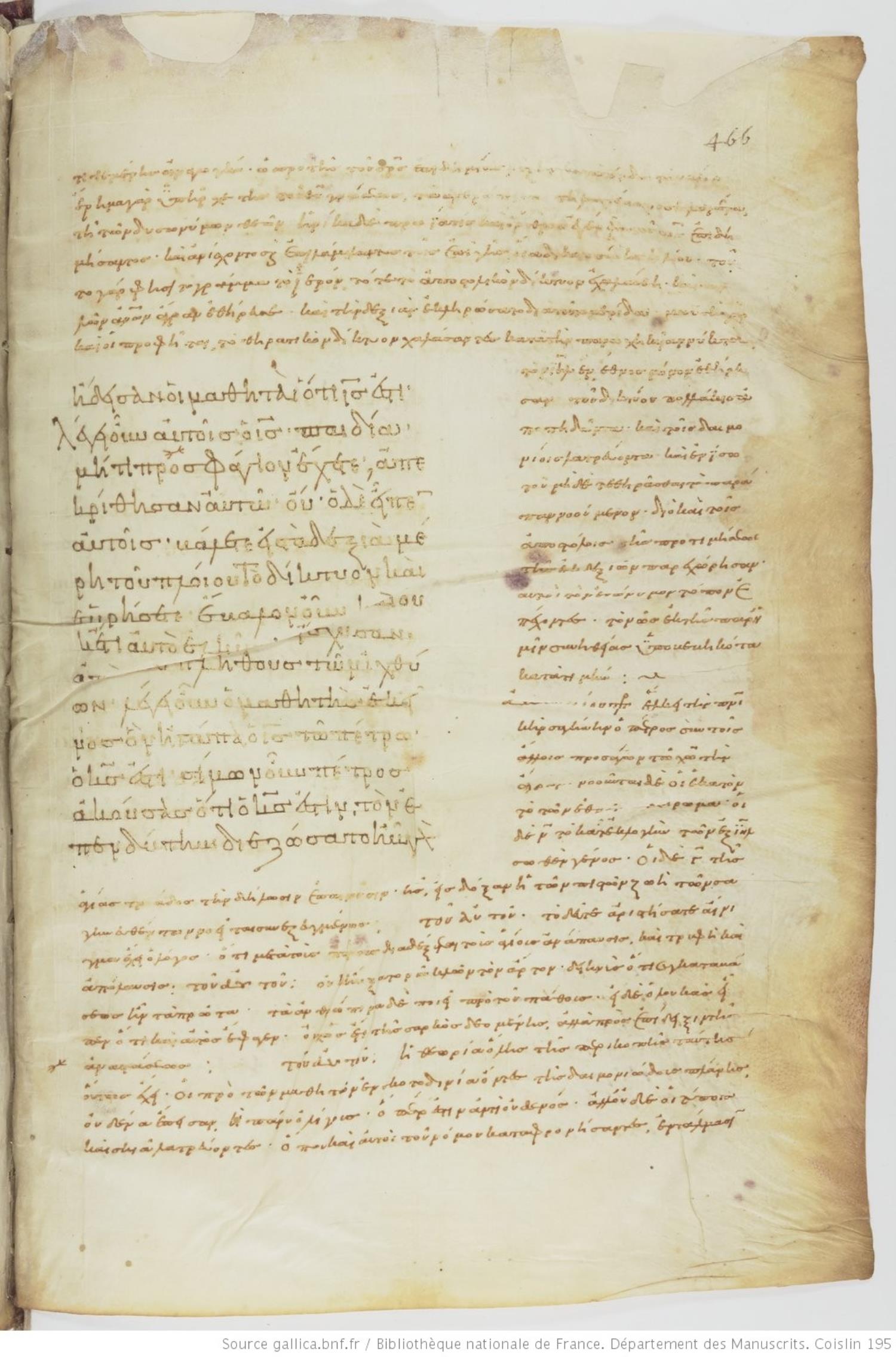 Tenth-century minuscule of the Gospels with commentary on parchment; 469 leaves, 1 column, varying number of lines per column. Images are made available by the Bilbiothèque Nationale. For recent images, please visit BNF Gallica.