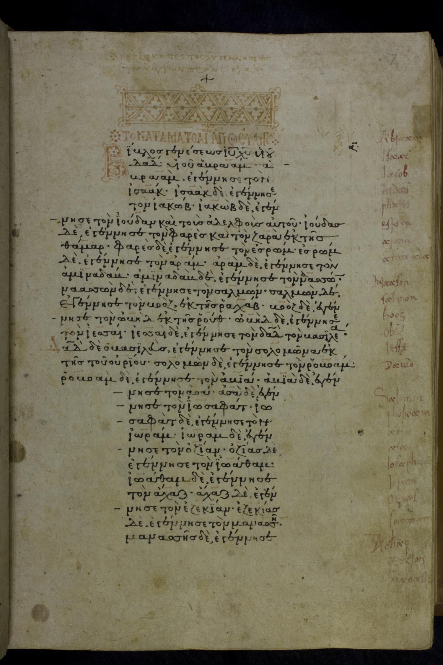 ΒΙΒΛΟΣ γενέσεως Ἰησοῦ Χριστοῦ υἱοῦ Δαυεὶδ / Δαυὶδ υἱοῦ Ἀβραάμ.
