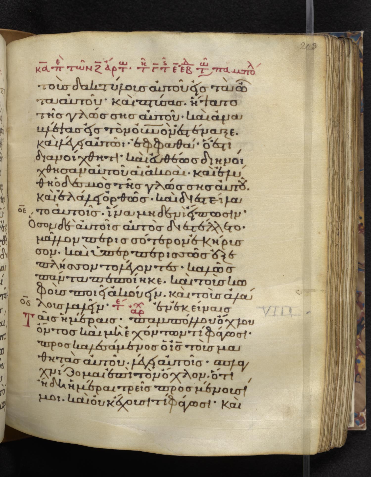 Eleventh-century minuscule of the Gospels on parchment; 310 leaves, 1 column, 22–24 lines per column. Images were taken at the Lambeth Palace Library.