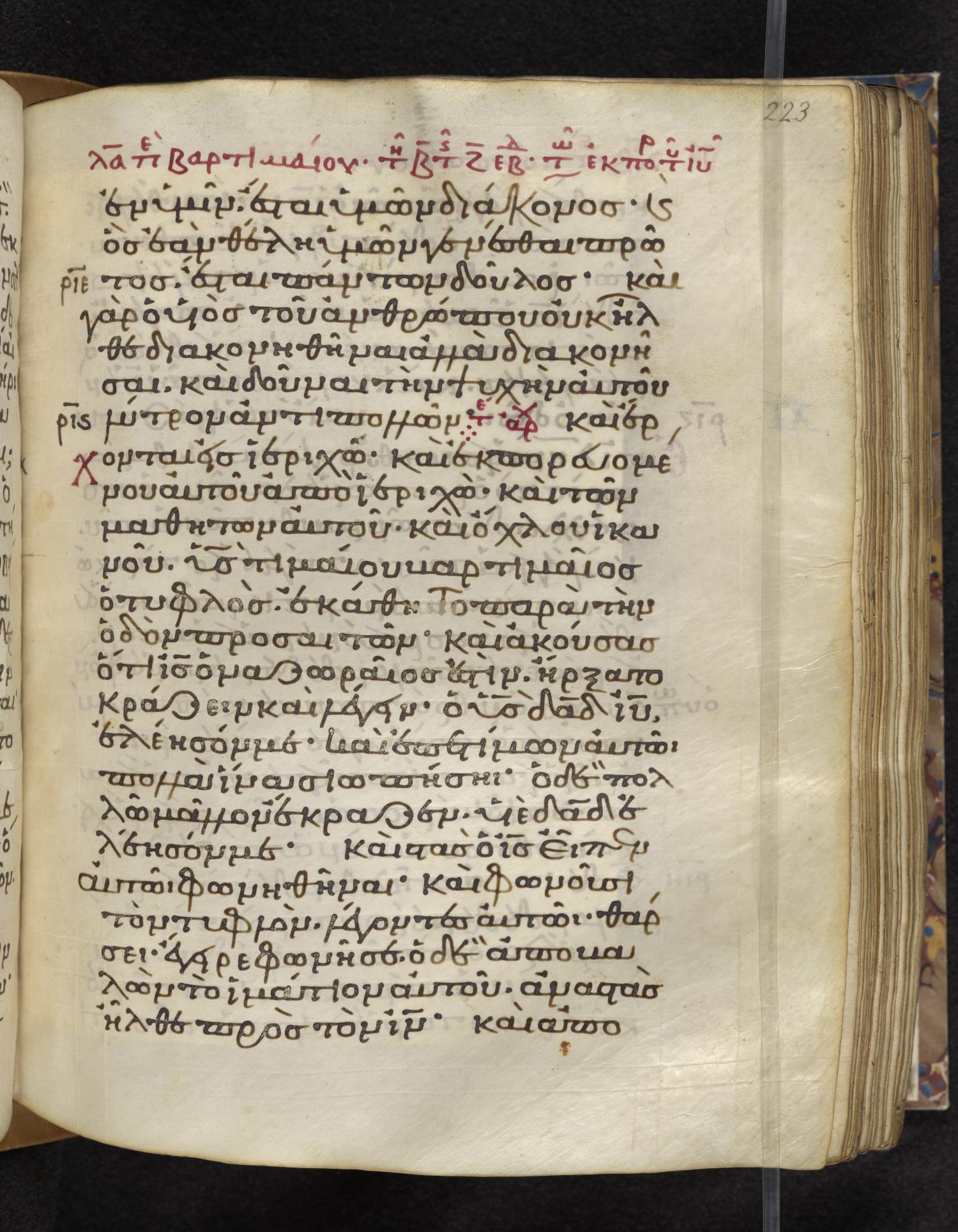 Eleventh-century minuscule of the Gospels on parchment; 310 leaves, 1 column, 22–24 lines per column. Images were taken at the Lambeth Palace Library.