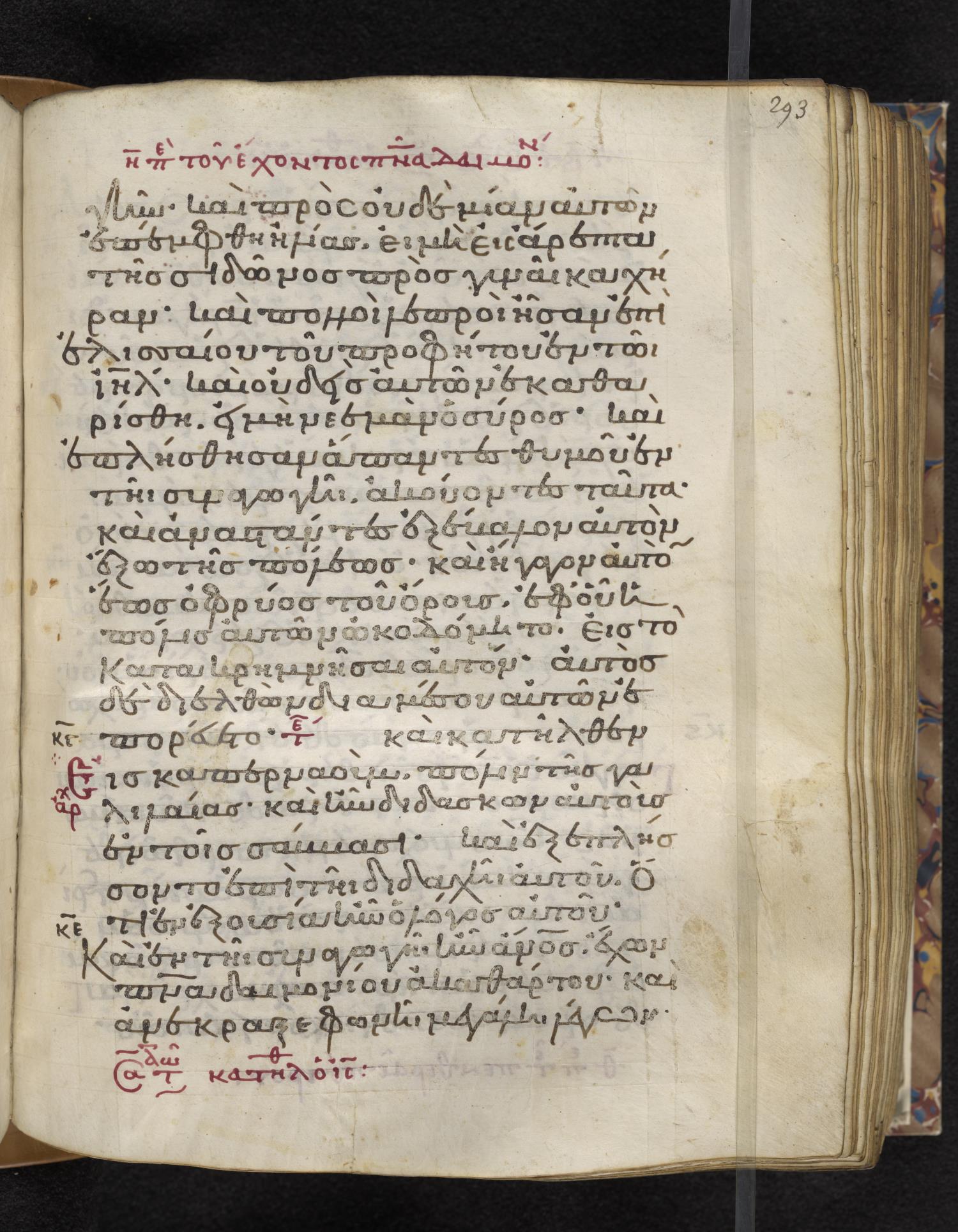 Eleventh-century minuscule of the Gospels on parchment; 310 leaves, 1 column, 22–24 lines per column. Images were taken at the Lambeth Palace Library.