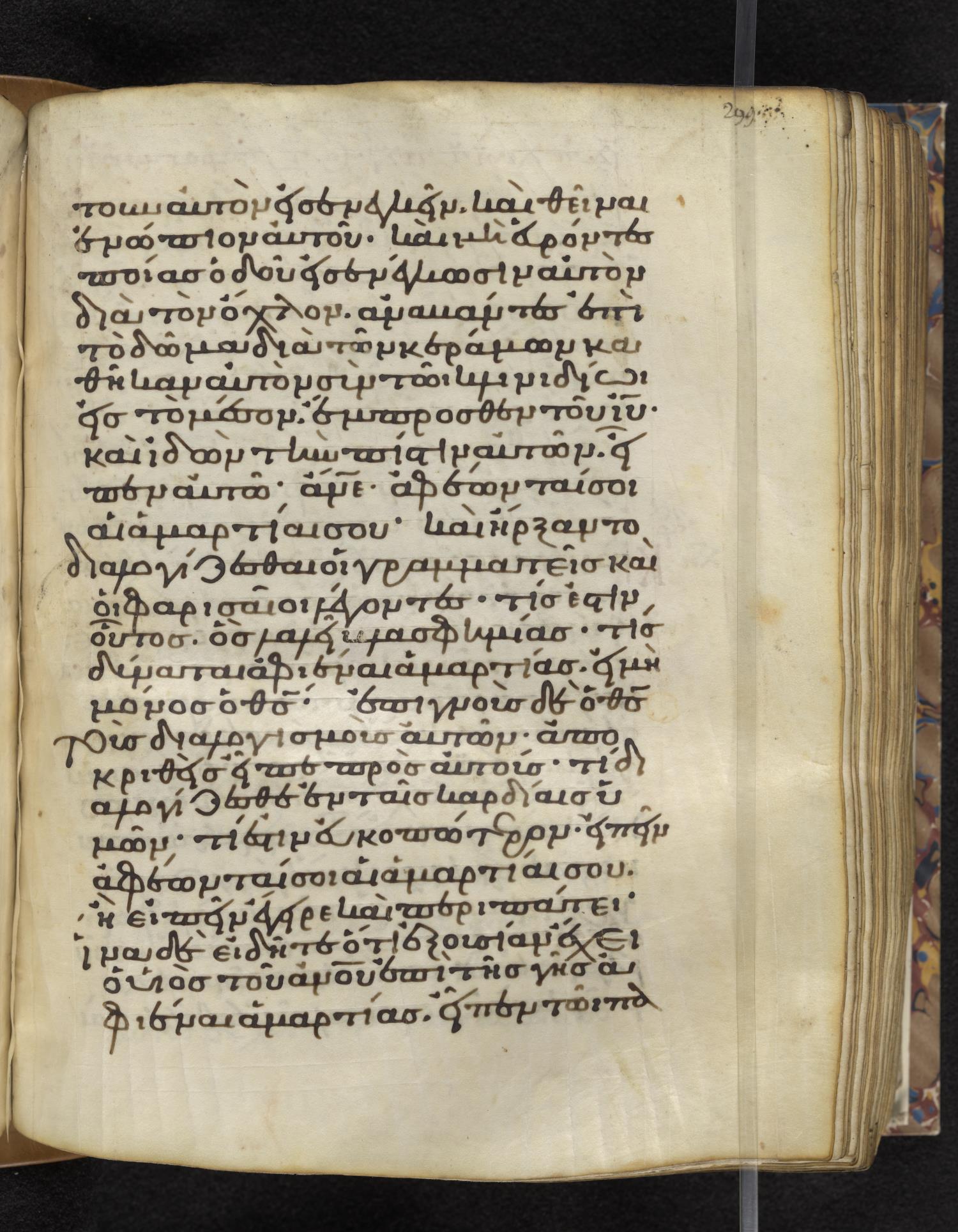 Eleventh-century minuscule of the Gospels on parchment; 310 leaves, 1 column, 22–24 lines per column. Images were taken at the Lambeth Palace Library.