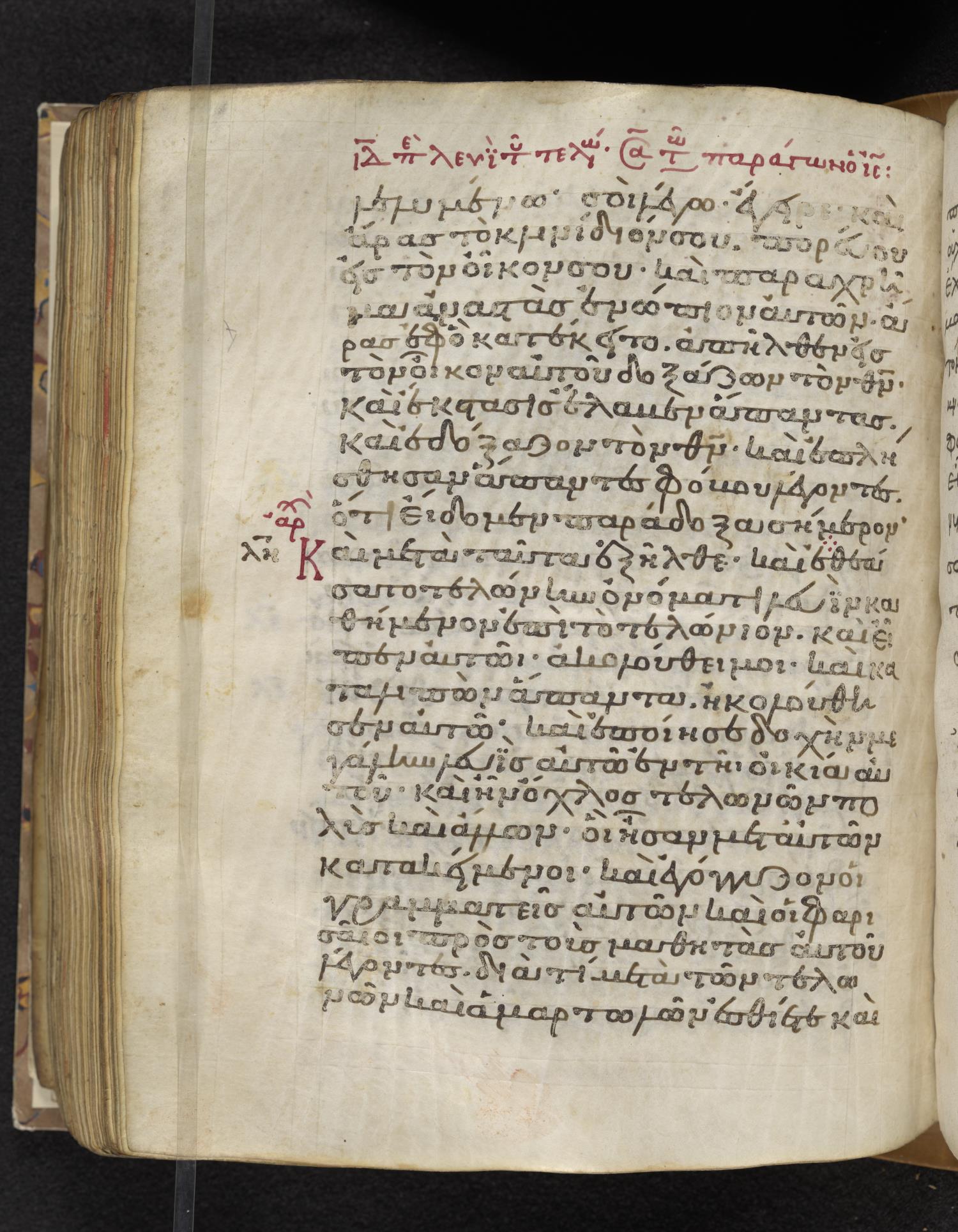 Eleventh-century minuscule of the Gospels on parchment; 310 leaves, 1 column, 22–24 lines per column. Images were taken at the Lambeth Palace Library.