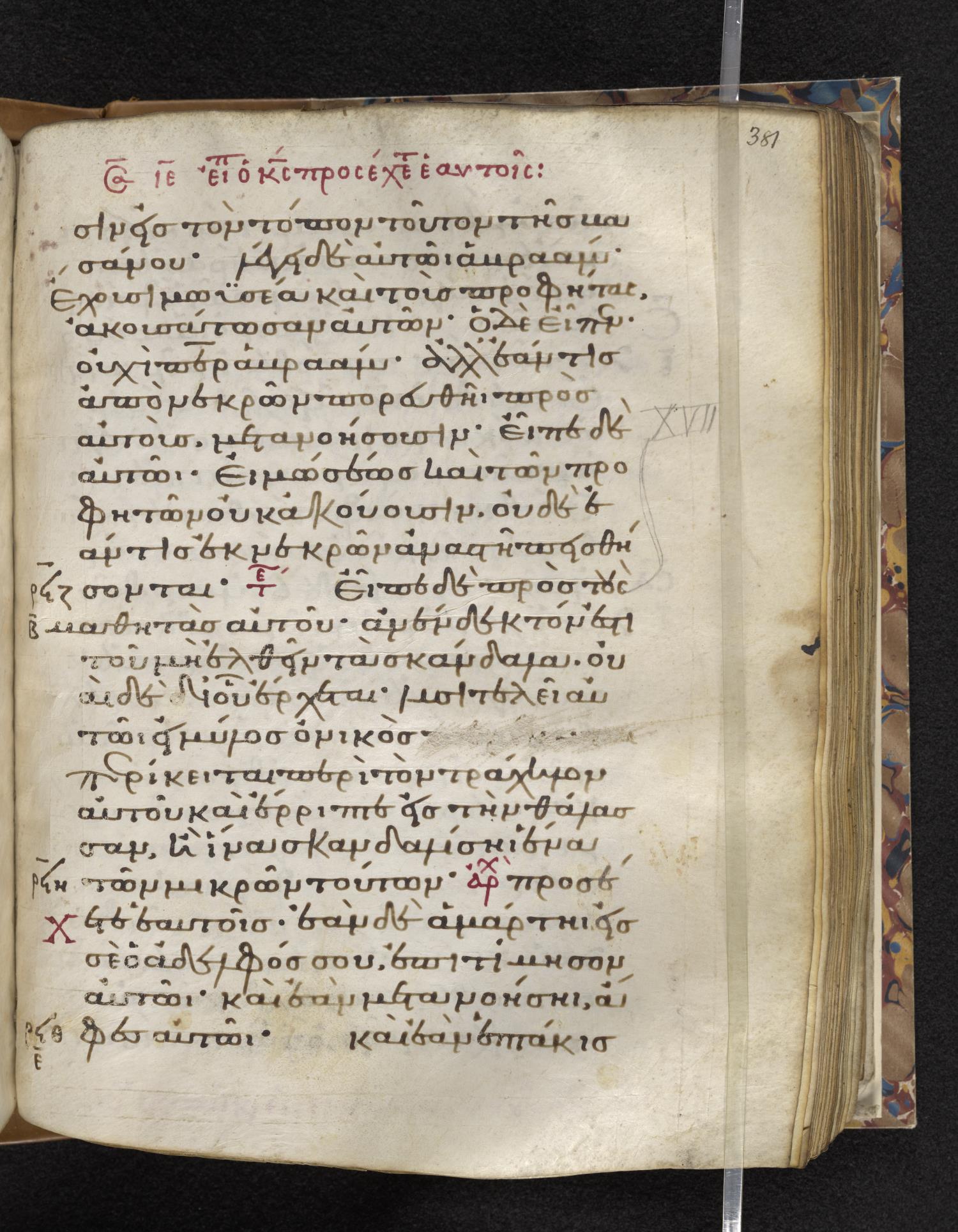 Eleventh-century minuscule of the Gospels on parchment; 310 leaves, 1 column, 22–24 lines per column. Images were taken at the Lambeth Palace Library.