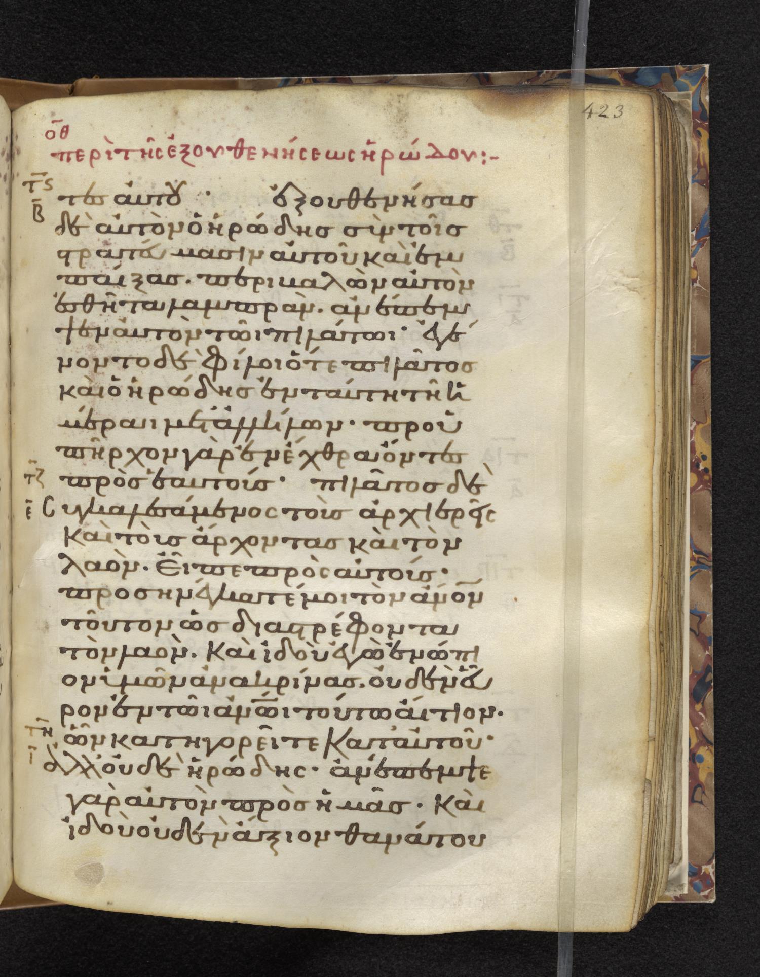 Eleventh-century minuscule of the Gospels on parchment; 310 leaves, 1 column, 22–24 lines per column. Images were taken at the Lambeth Palace Library.