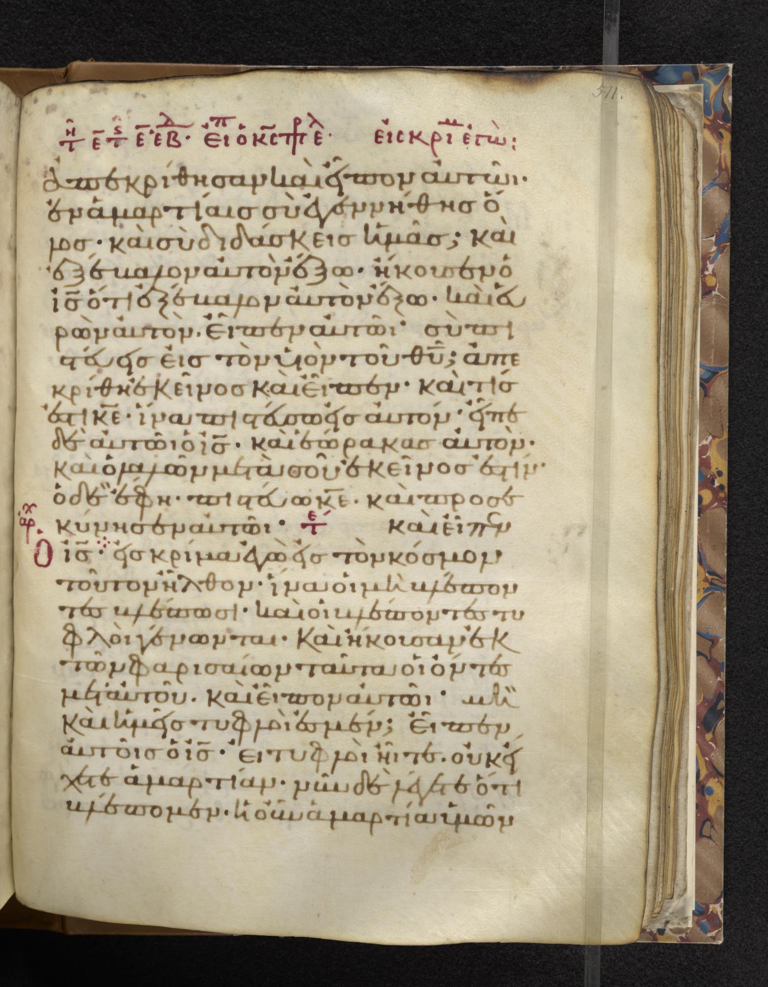 Eleventh-century minuscule of the Gospels on parchment; 310 leaves, 1 column, 22–24 lines per column. Images were taken at the Lambeth Palace Library.