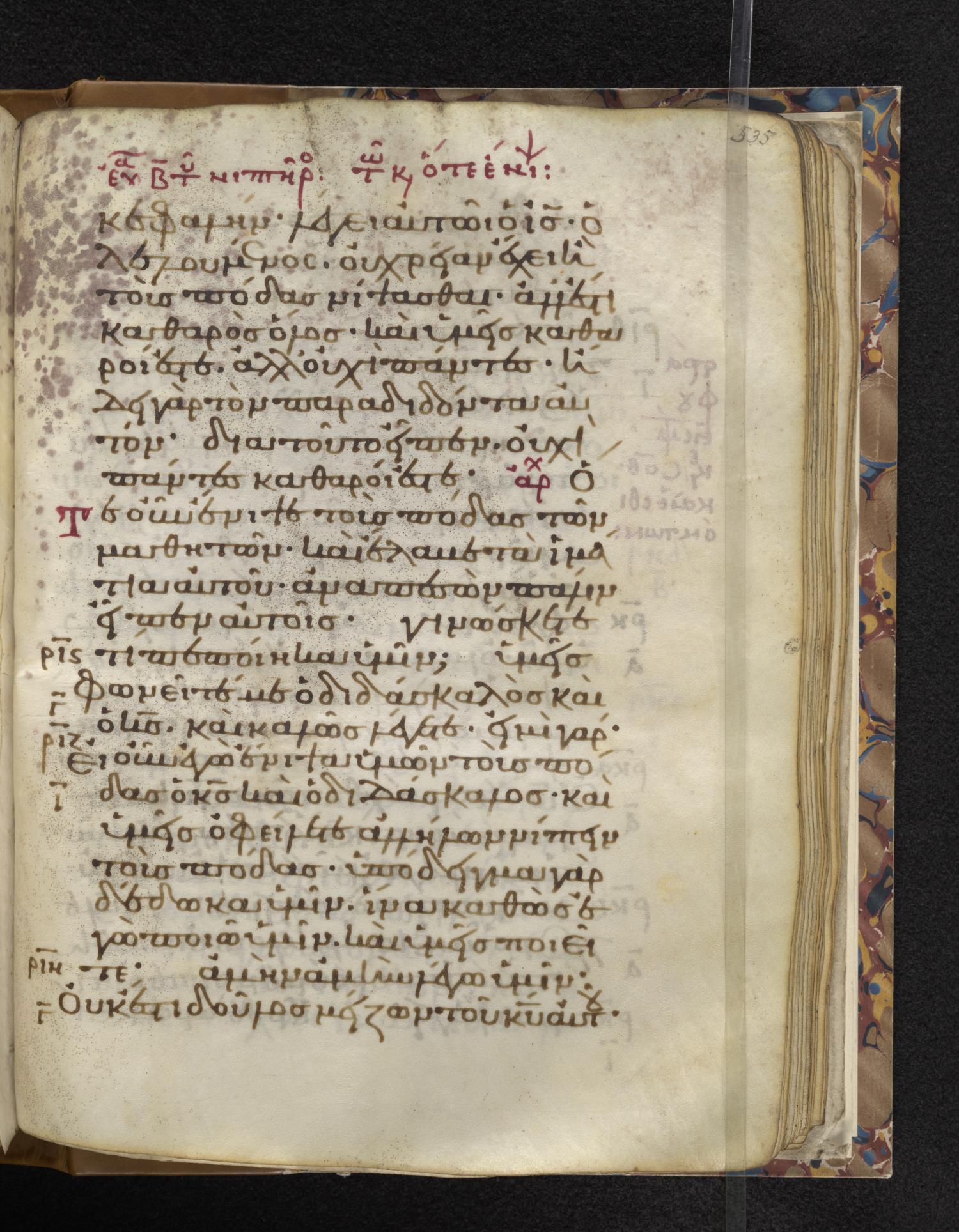 Eleventh-century minuscule of the Gospels on parchment; 310 leaves, 1 column, 22–24 lines per column. Images were taken at the Lambeth Palace Library.