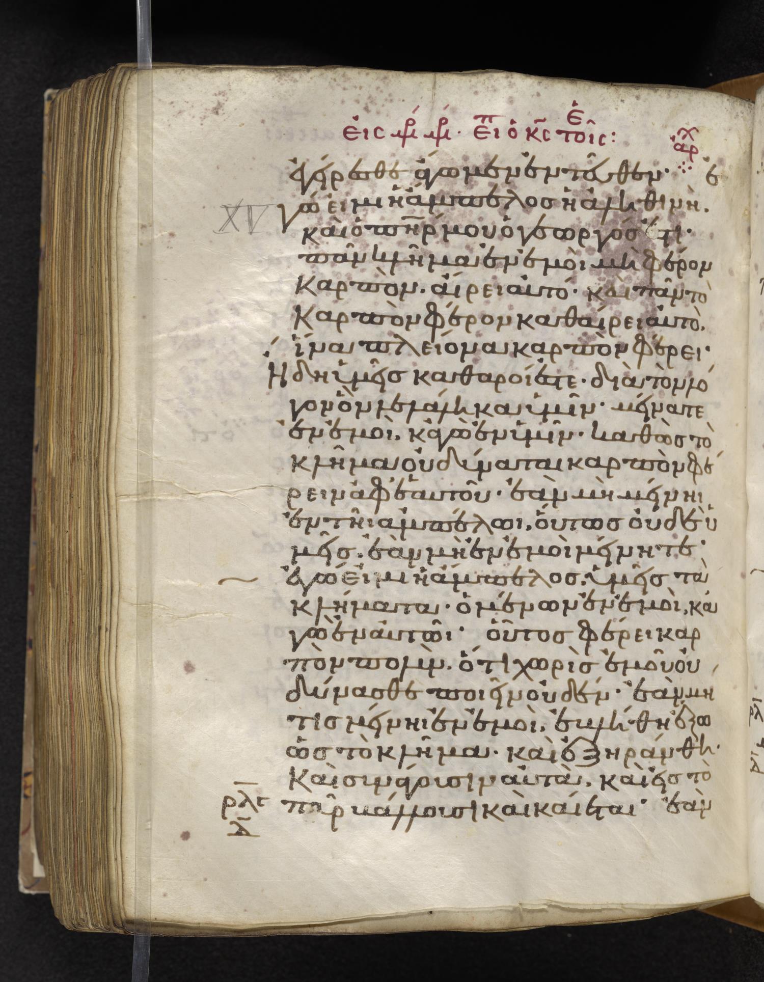 ἐγώ εἰμι ἡ ἄμπελος, ὑμεῖς τὰ κλήματα. ὁ μένων ἐν ἐμοὶ κἀγὼ ἐν αὐτῷ οὗτος φέρει καρπὸν πολύν, ὅτι χωρὶς ἐμοῦ οὐ δύνασθε ποιεῖν οὐδέν.