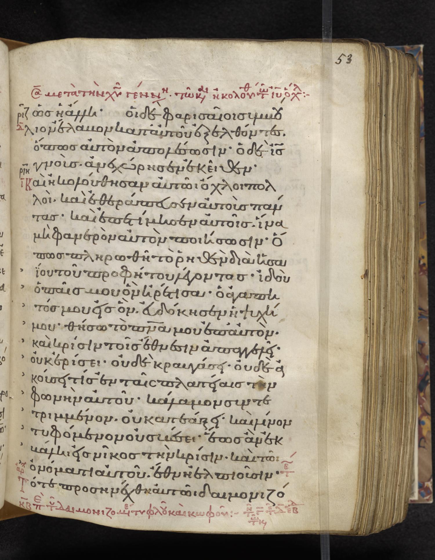 Eleventh-century minuscule of the Gospels on parchment; 310 leaves, 1 column, 22–24 lines per column. Images were taken at the Lambeth Palace Library.