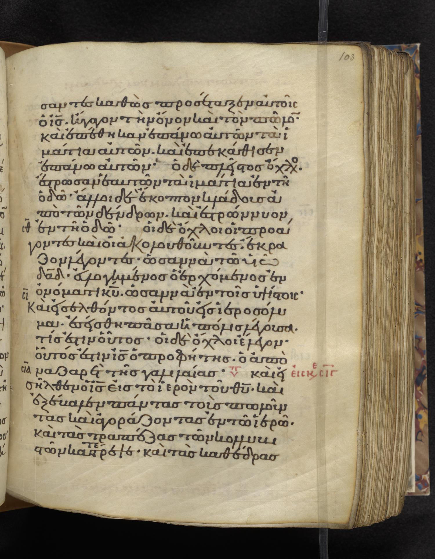 Eleventh-century minuscule of the Gospels on parchment; 310 leaves, 1 column, 22–24 lines per column. Images were taken at the Lambeth Palace Library.