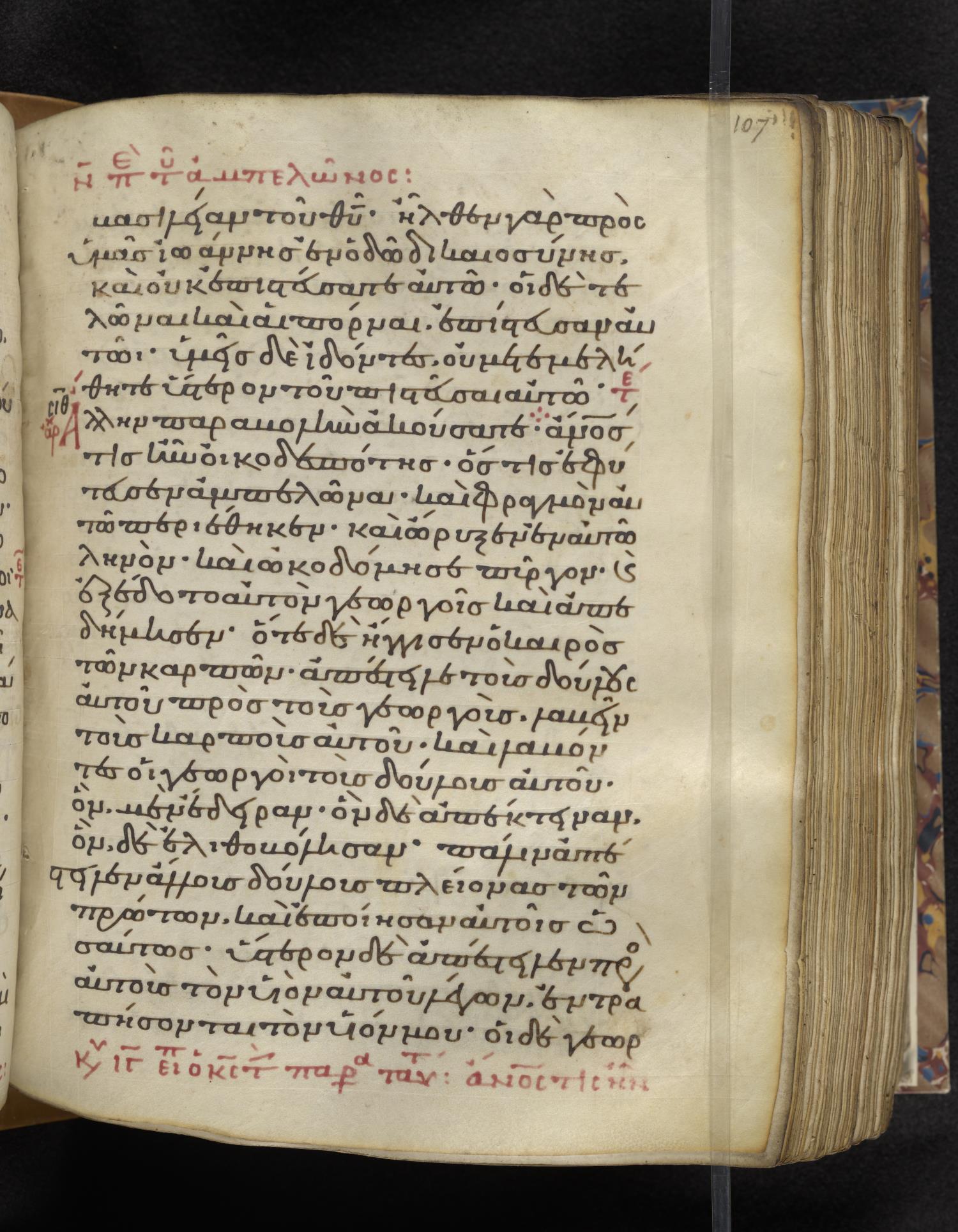 Eleventh-century minuscule of the Gospels on parchment; 310 leaves, 1 column, 22–24 lines per column. Images were taken at the Lambeth Palace Library.