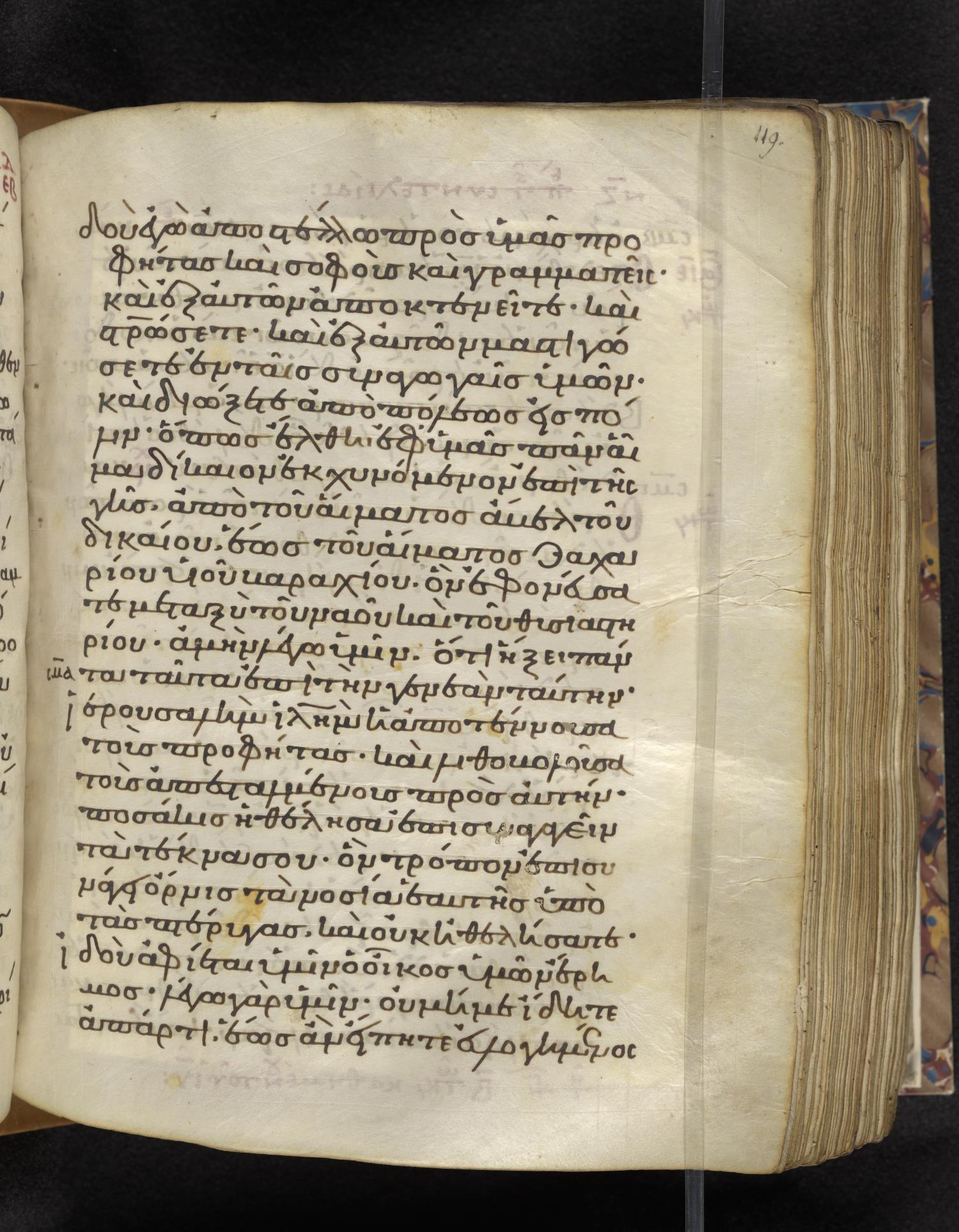 ὅπως ἔλθῃ ἐφ´ ὑμᾶς πᾶν αἷμα δίκαιον ἐκχυννόμενον ἐπὶ τῆς γῆς ἀπὸ τοῦ αἵματος Ἅβελ τοῦ δικαίου ἕως τοῦ αἵματος Ζαχαρίου υἱοῦ Βαραχίου, ὃν ἐφονεύσατε μεταξὺ τοῦ ναοῦ καὶ τοῦ θυσιαστηρίου.