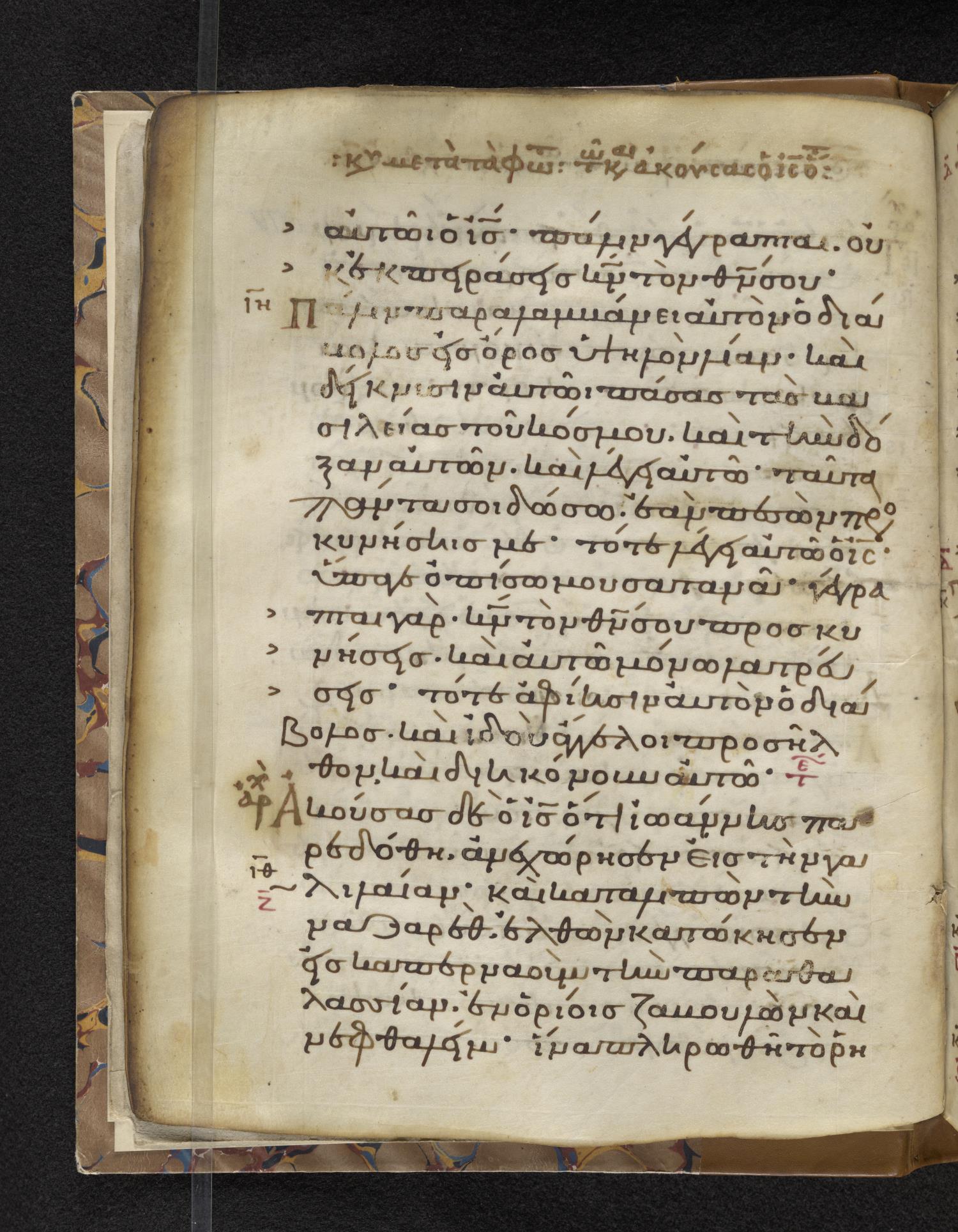 Eleventh-century minuscule of the Gospels on parchment; 310 leaves, 1 column, 22–24 lines per column. Images were taken at the Lambeth Palace Library.