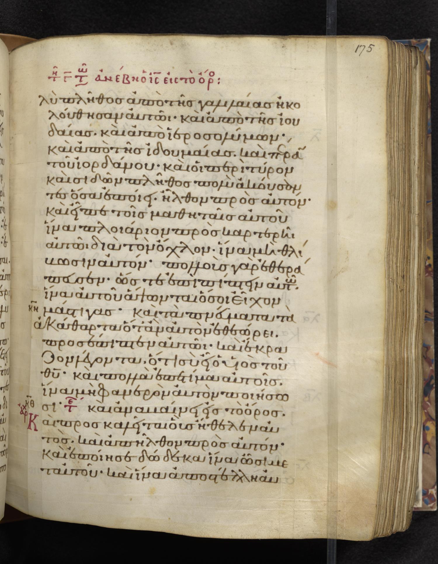 Eleventh-century minuscule of the Gospels on parchment; 310 leaves, 1 column, 22–24 lines per column. Images were taken at the Lambeth Palace Library.