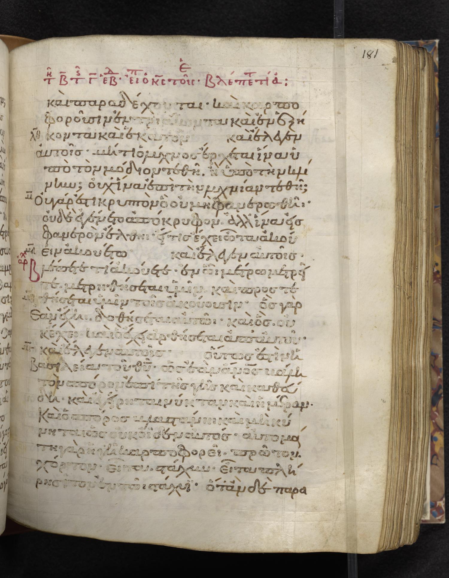 Eleventh-century minuscule of the Gospels on parchment; 310 leaves, 1 column, 22–24 lines per column. Images were taken at the Lambeth Palace Library.