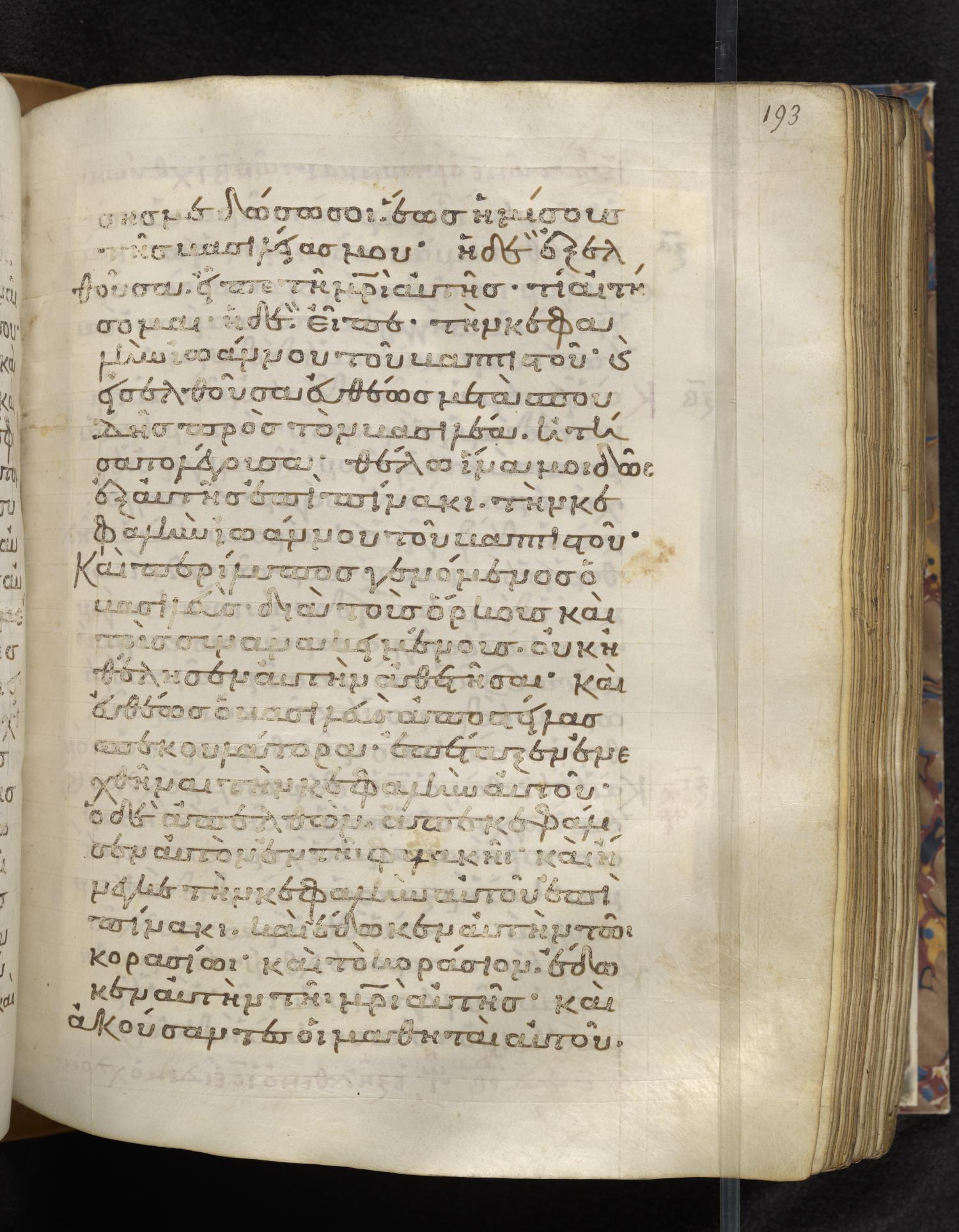 Eleventh-century minuscule of the Gospels on parchment; 310 leaves, 1 column, 22–24 lines per column. Images were taken at the Lambeth Palace Library.