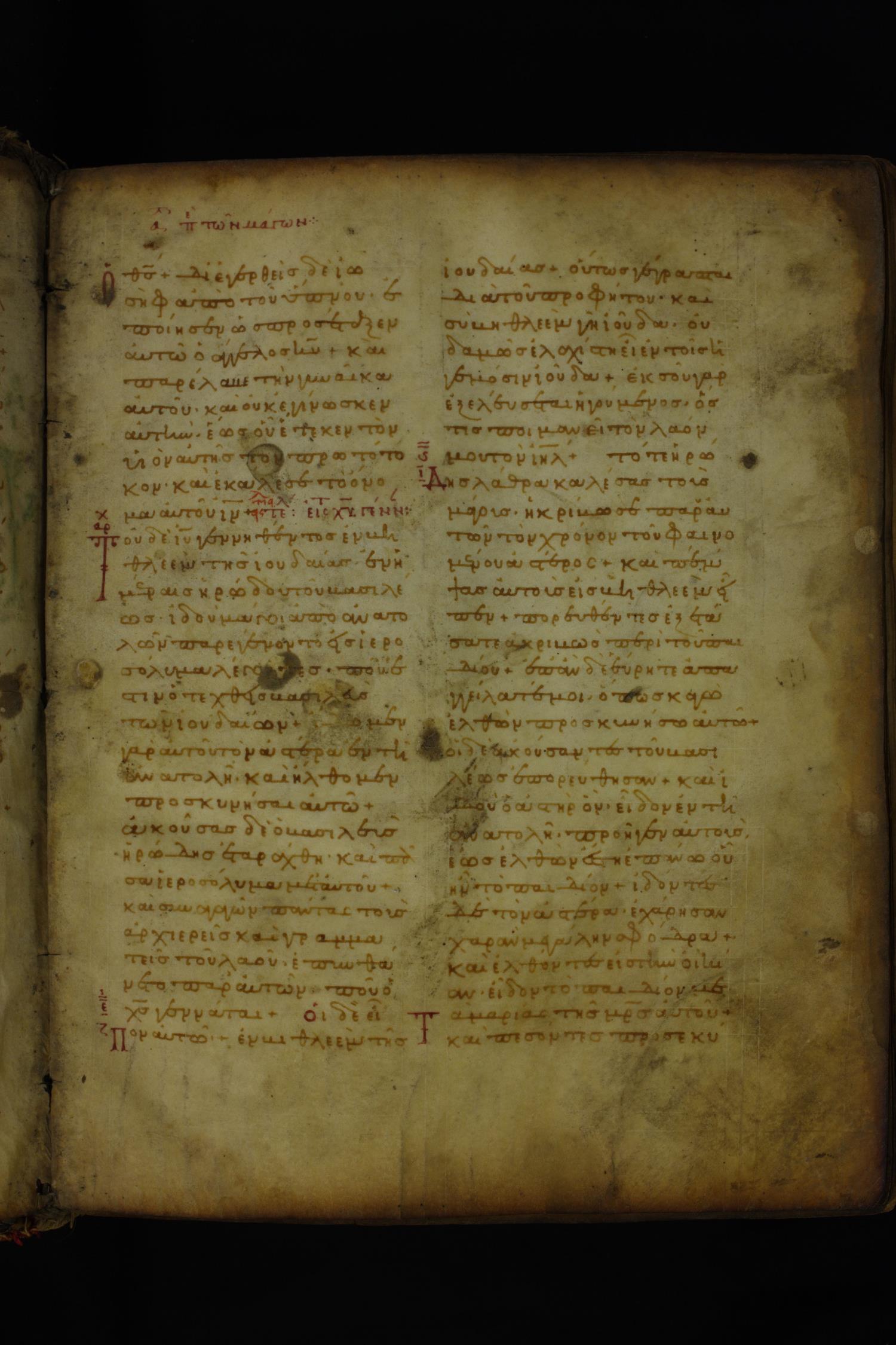 Twelfth century minuscule of the Gospels on parchment; 185 leaves, 2 columns, 26–30 lines per column.