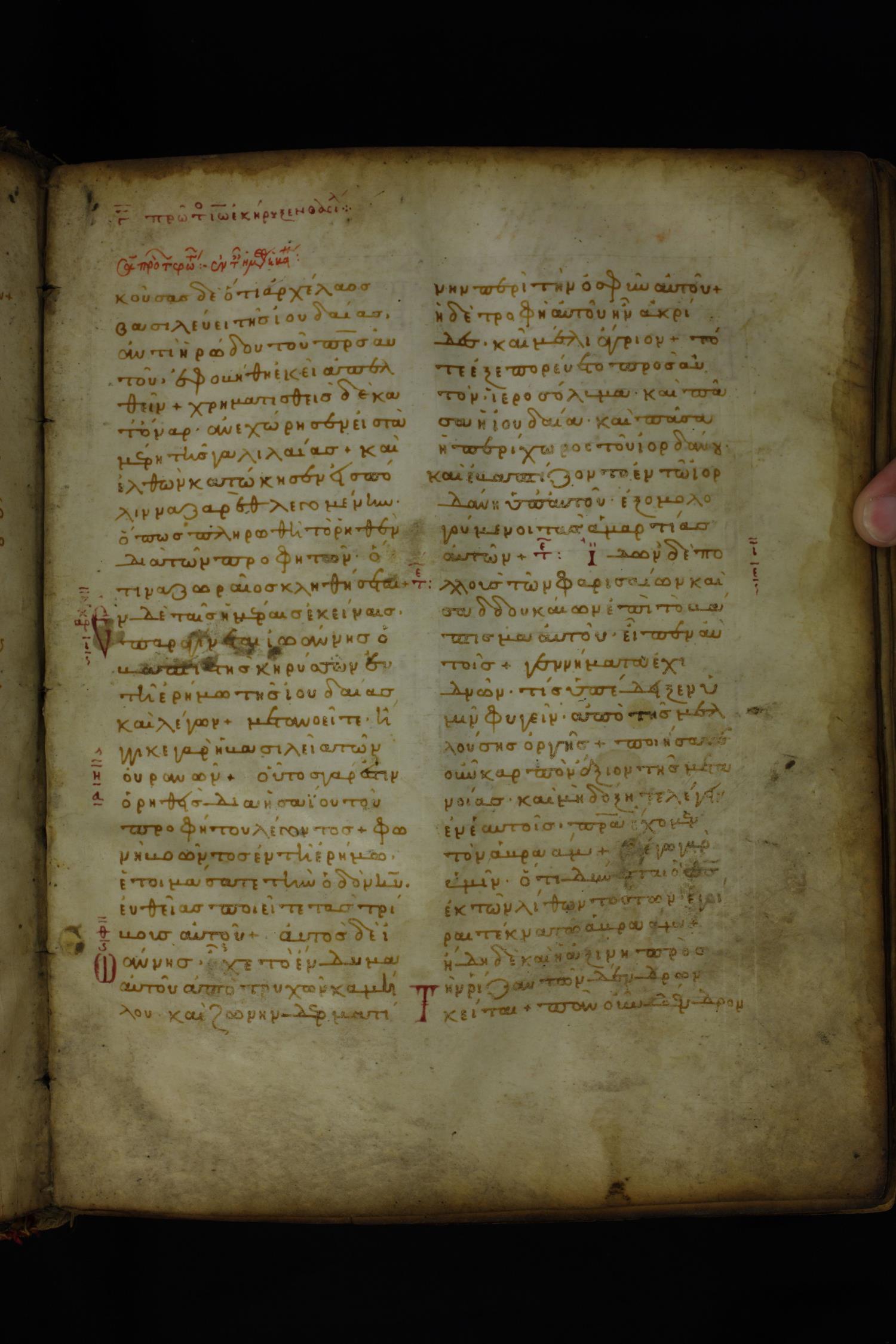 Twelfth century minuscule of the Gospels on parchment; 185 leaves, 2 columns, 26–30 lines per column.