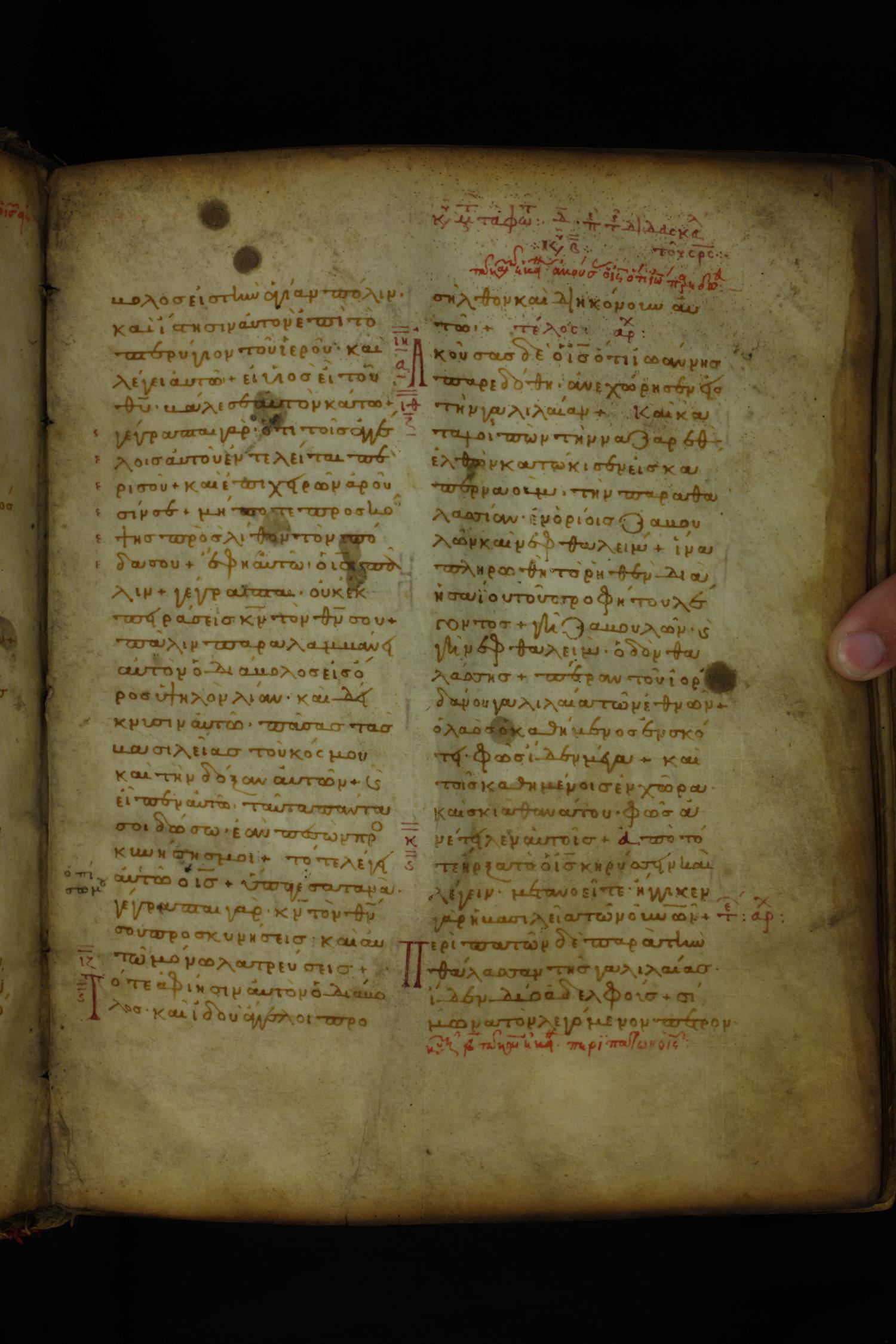 Twelfth century minuscule of the Gospels on parchment; 185 leaves, 2 columns, 26–30 lines per column.