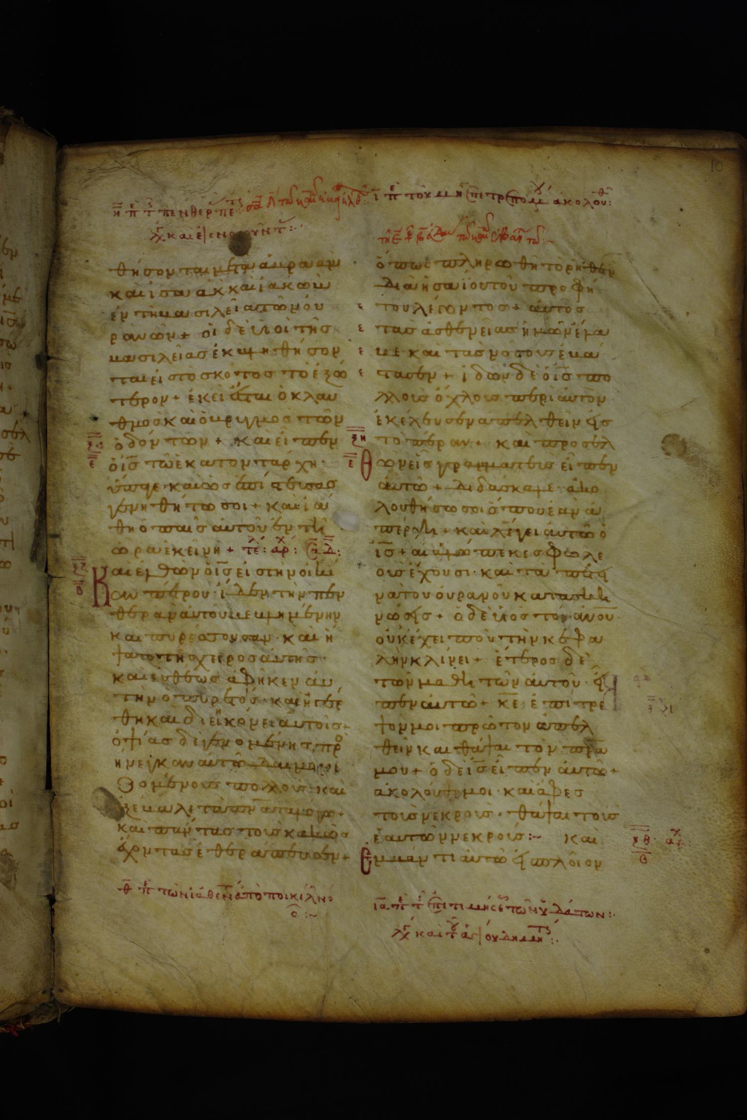 Twelfth century minuscule of the Gospels on parchment; 185 leaves, 2 columns, 26–30 lines per column.