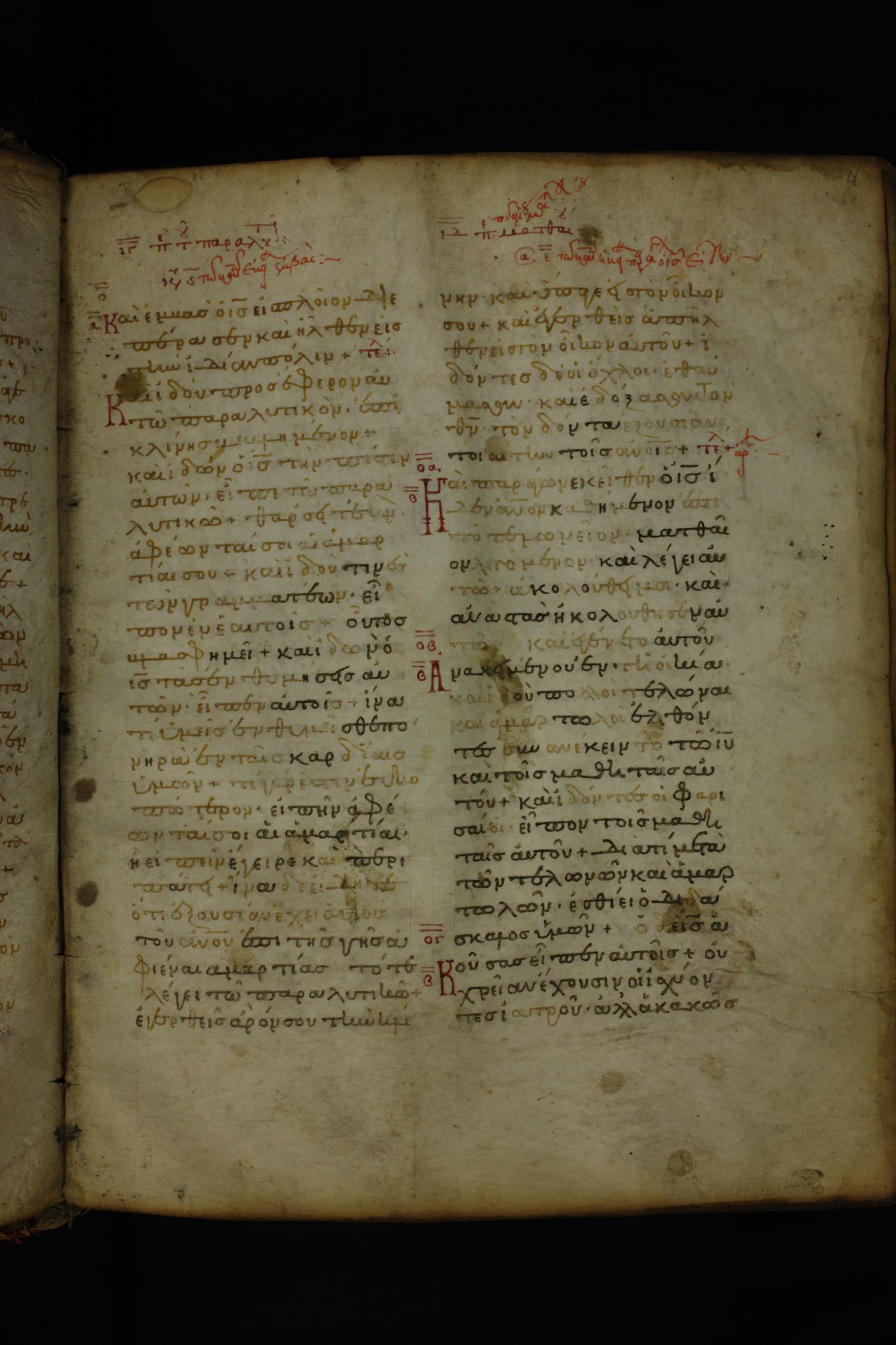 Twelfth century minuscule of the Gospels on parchment; 185 leaves, 2 columns, 26–30 lines per column.