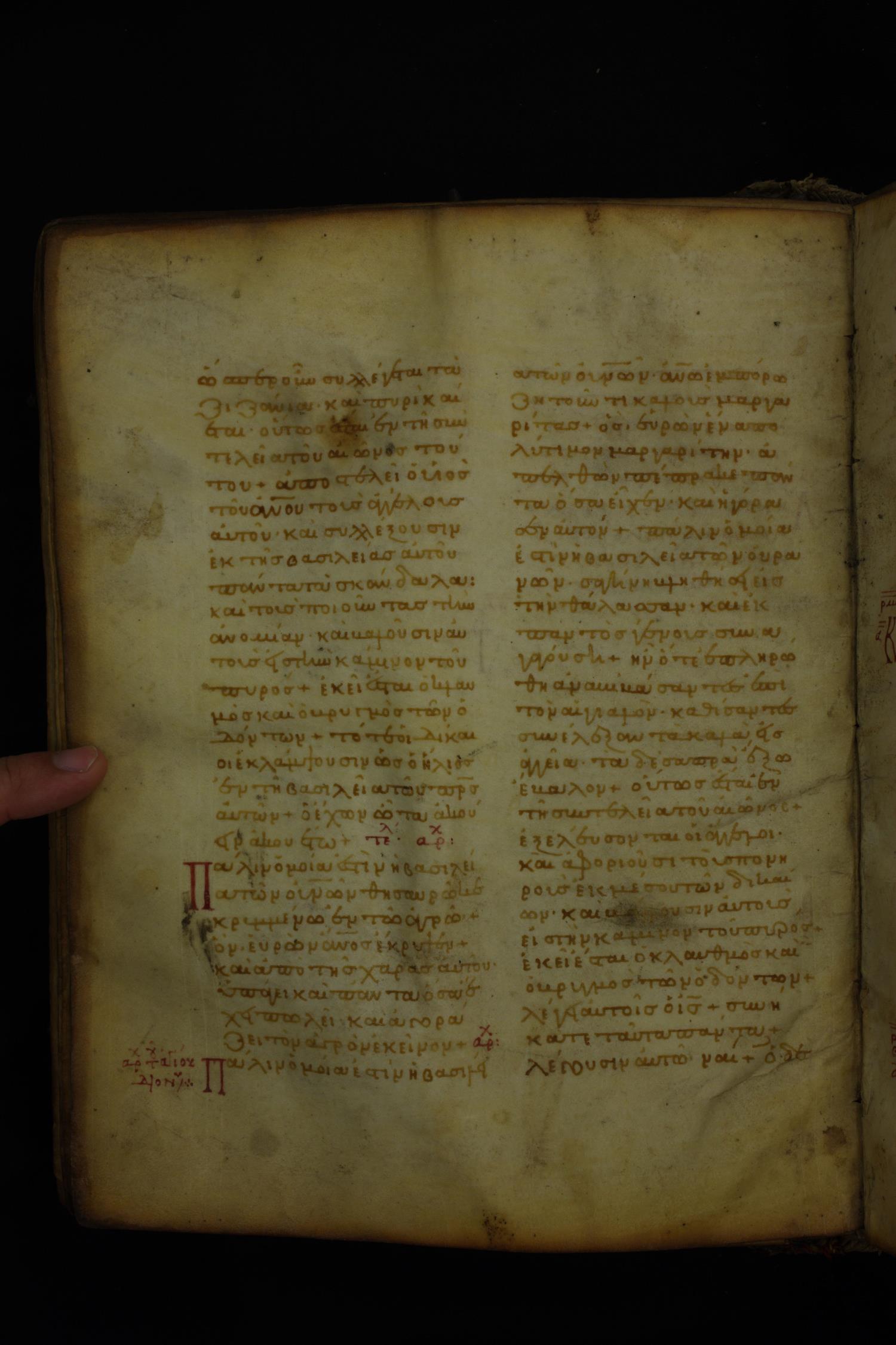 Twelfth century minuscule of the Gospels on parchment; 185 leaves, 2 columns, 26–30 lines per column.