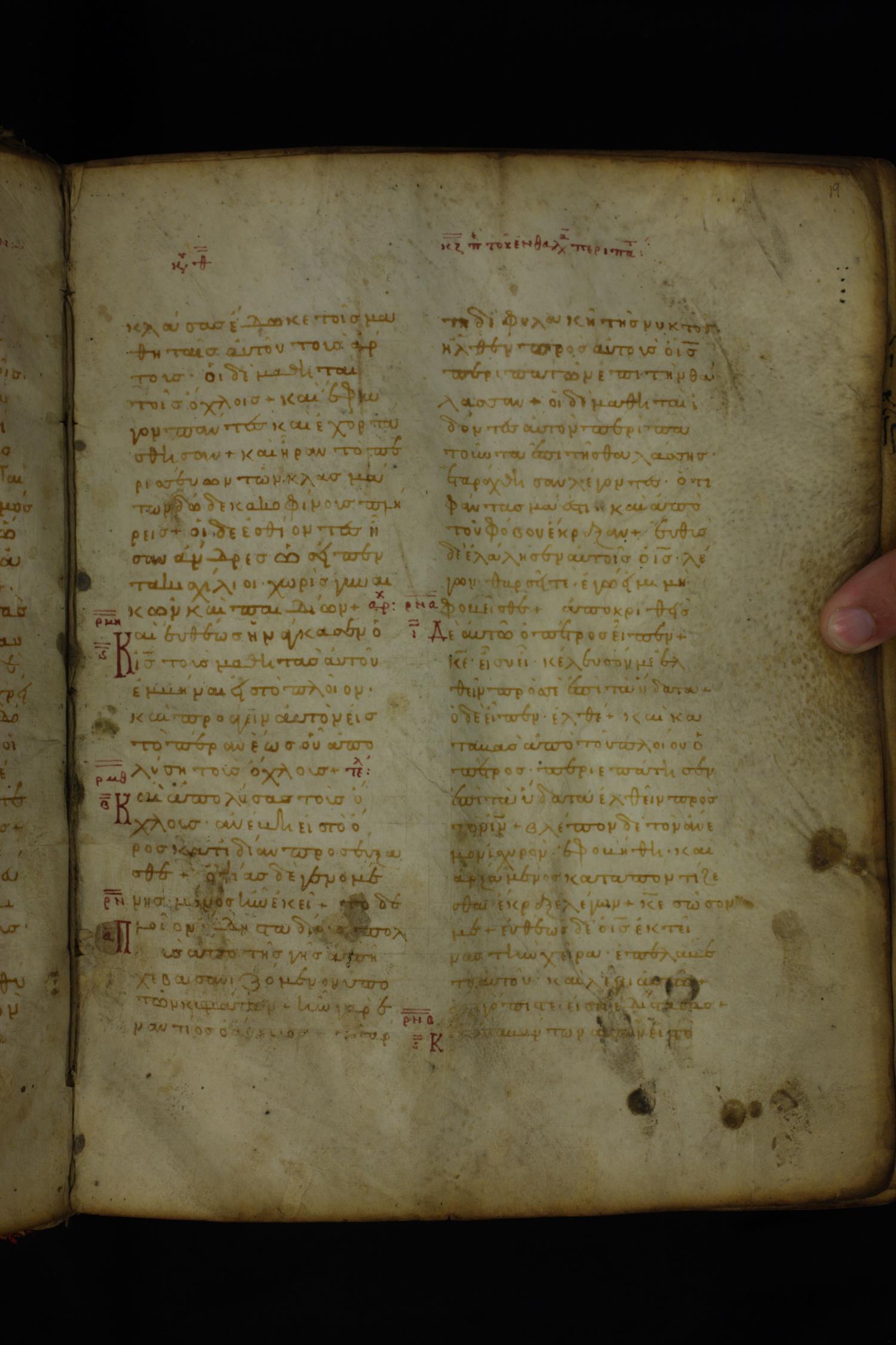 Twelfth century minuscule of the Gospels on parchment; 185 leaves, 2 columns, 26–30 lines per column.