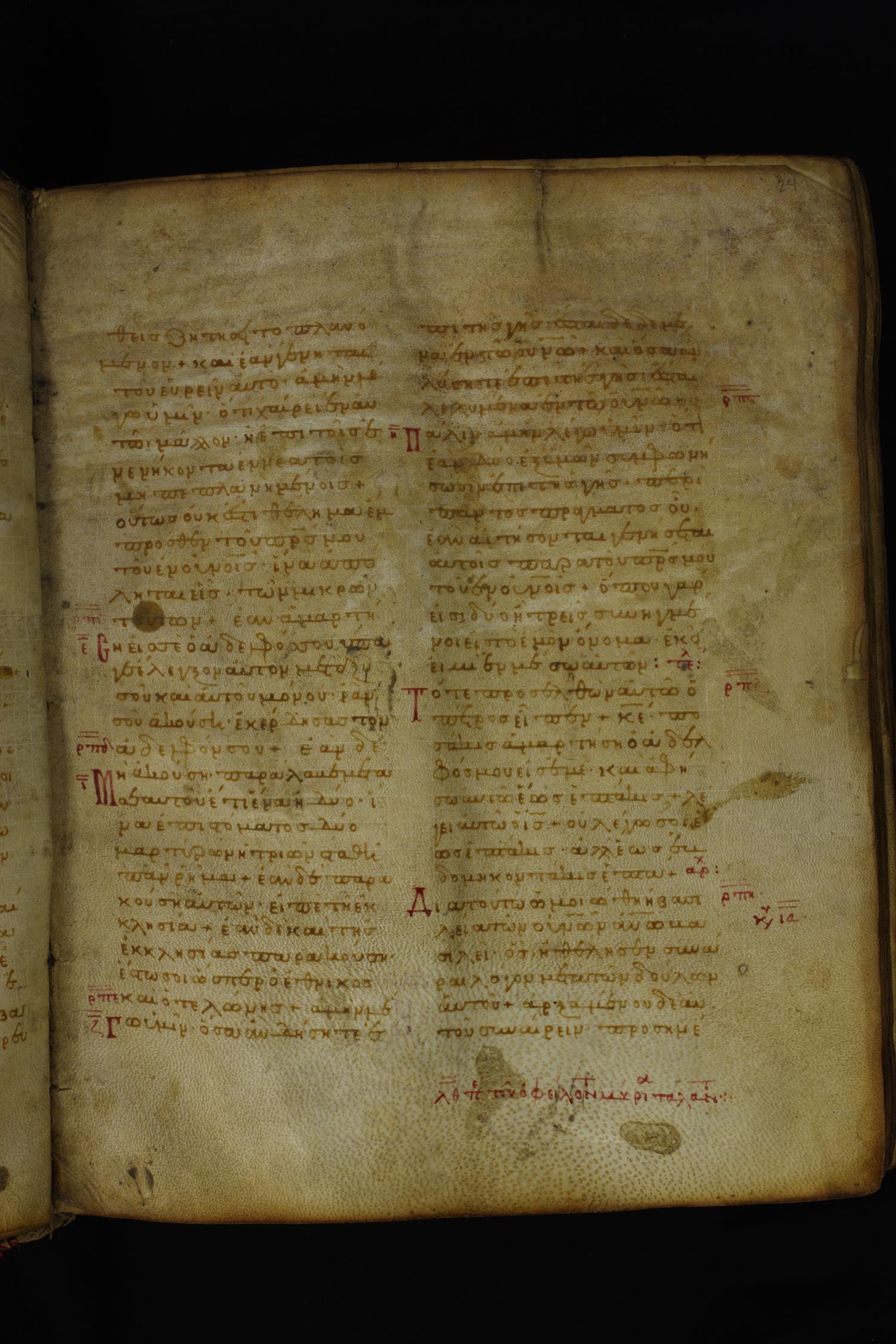 Twelfth century minuscule of the Gospels on parchment; 185 leaves, 2 columns, 26–30 lines per column.