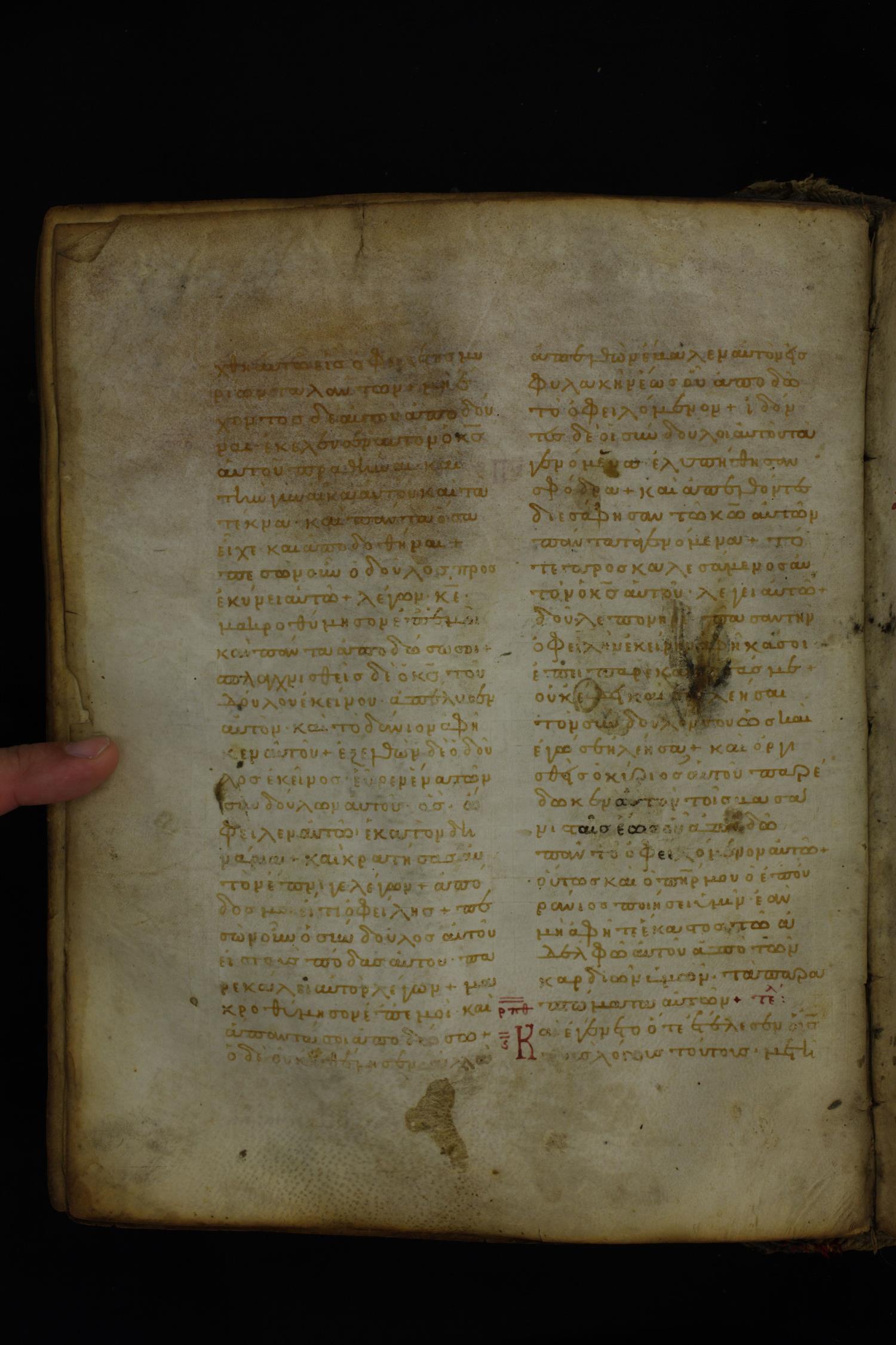 Twelfth century minuscule of the Gospels on parchment; 185 leaves, 2 columns, 26–30 lines per column.