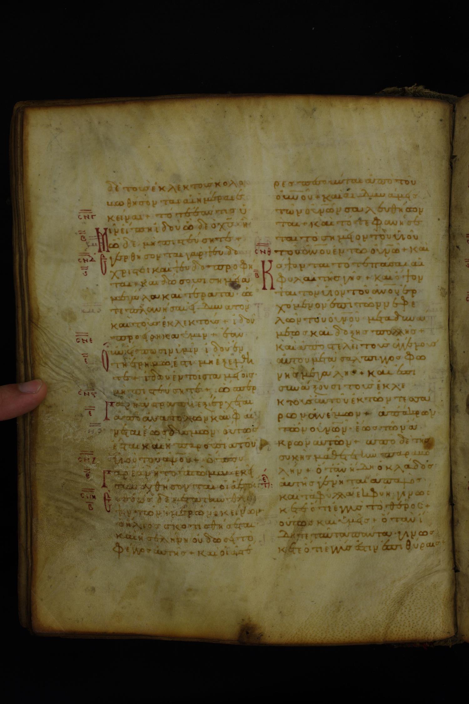 Twelfth century minuscule of the Gospels on parchment; 185 leaves, 2 columns, 26–30 lines per column.