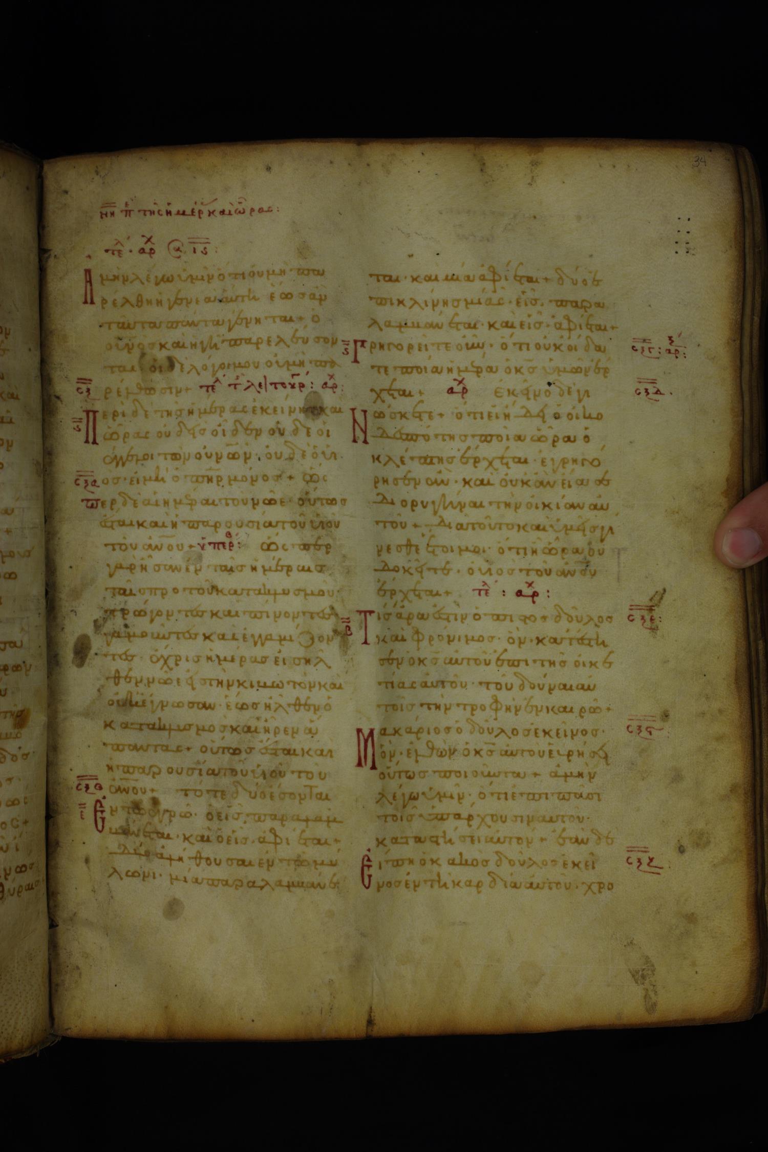 Twelfth century minuscule of the Gospels on parchment; 185 leaves, 2 columns, 26–30 lines per column.