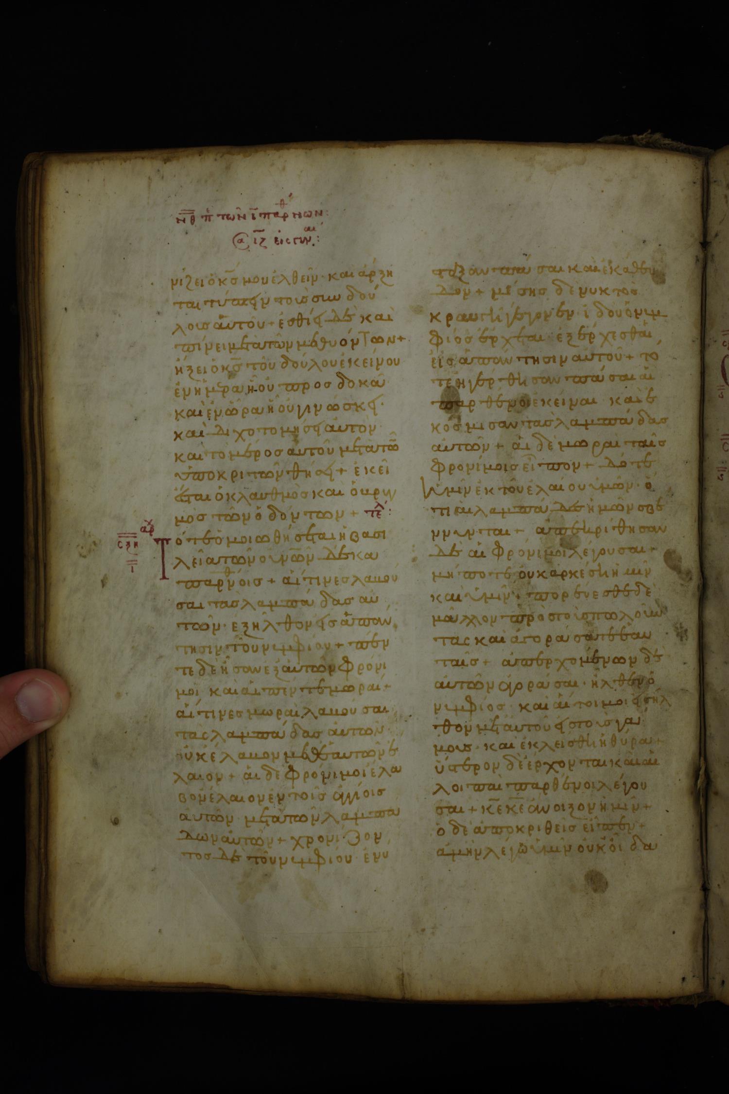 Twelfth century minuscule of the Gospels on parchment; 185 leaves, 2 columns, 26–30 lines per column.