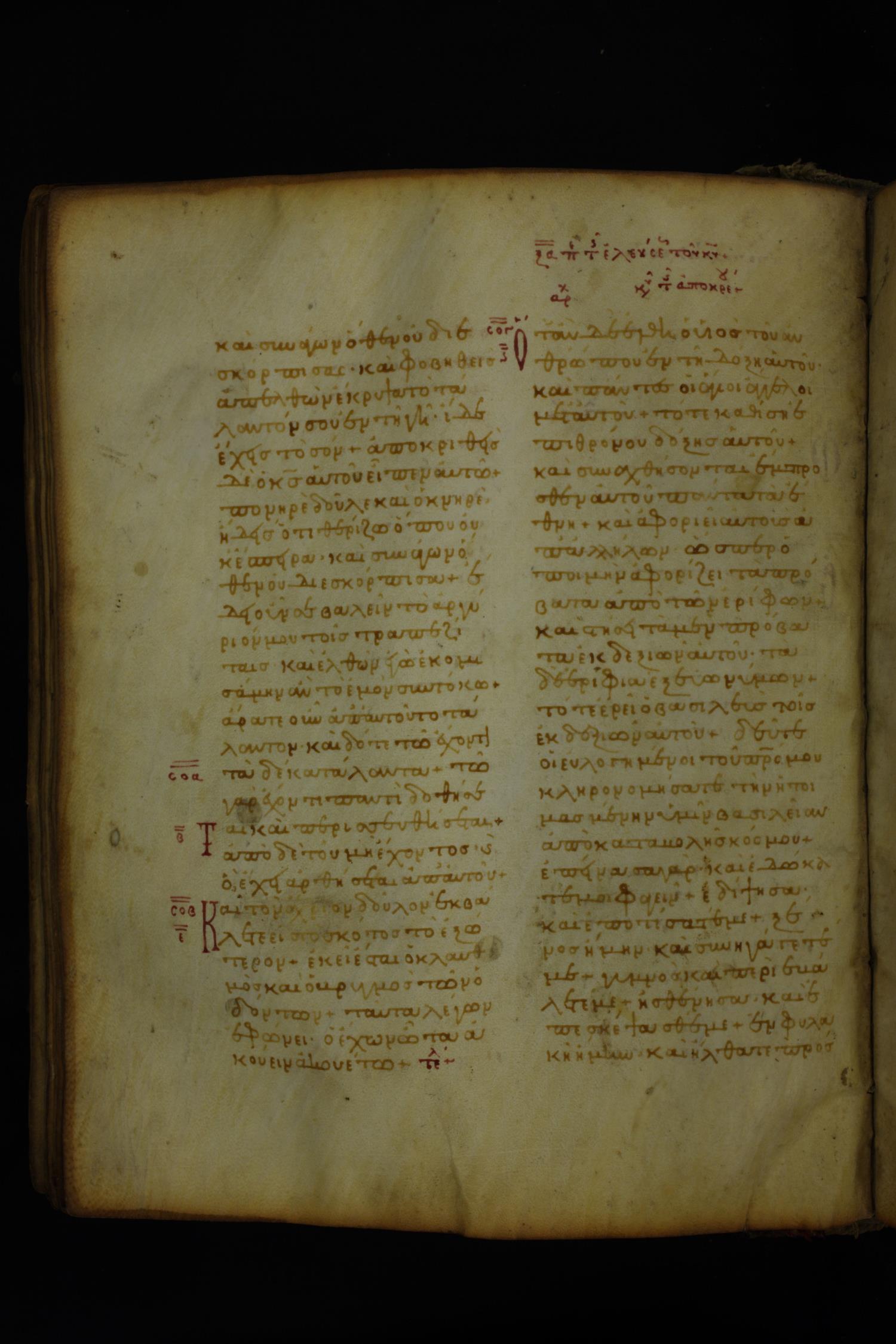 Twelfth century minuscule of the Gospels on parchment; 185 leaves, 2 columns, 26–30 lines per column.