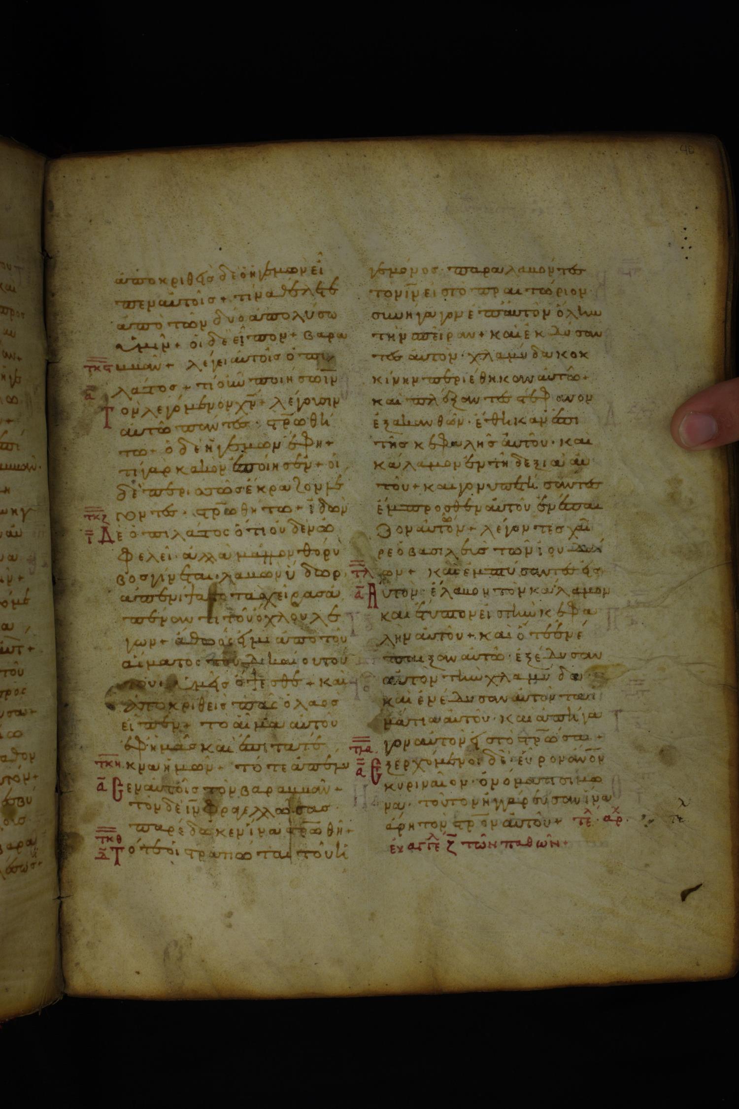 Twelfth century minuscule of the Gospels on parchment; 185 leaves, 2 columns, 26–30 lines per column.