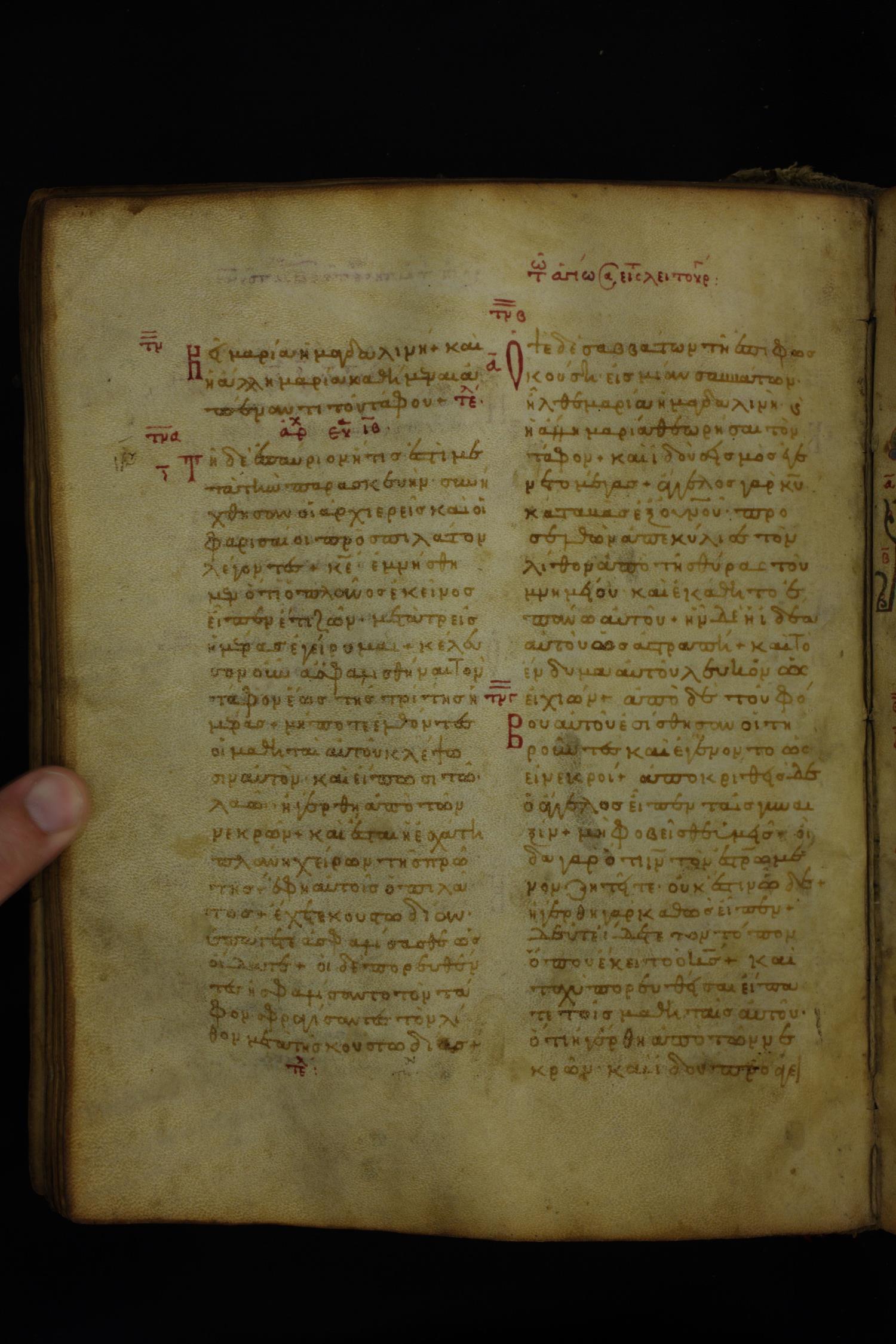 Twelfth century minuscule of the Gospels on parchment; 185 leaves, 2 columns, 26–30 lines per column.