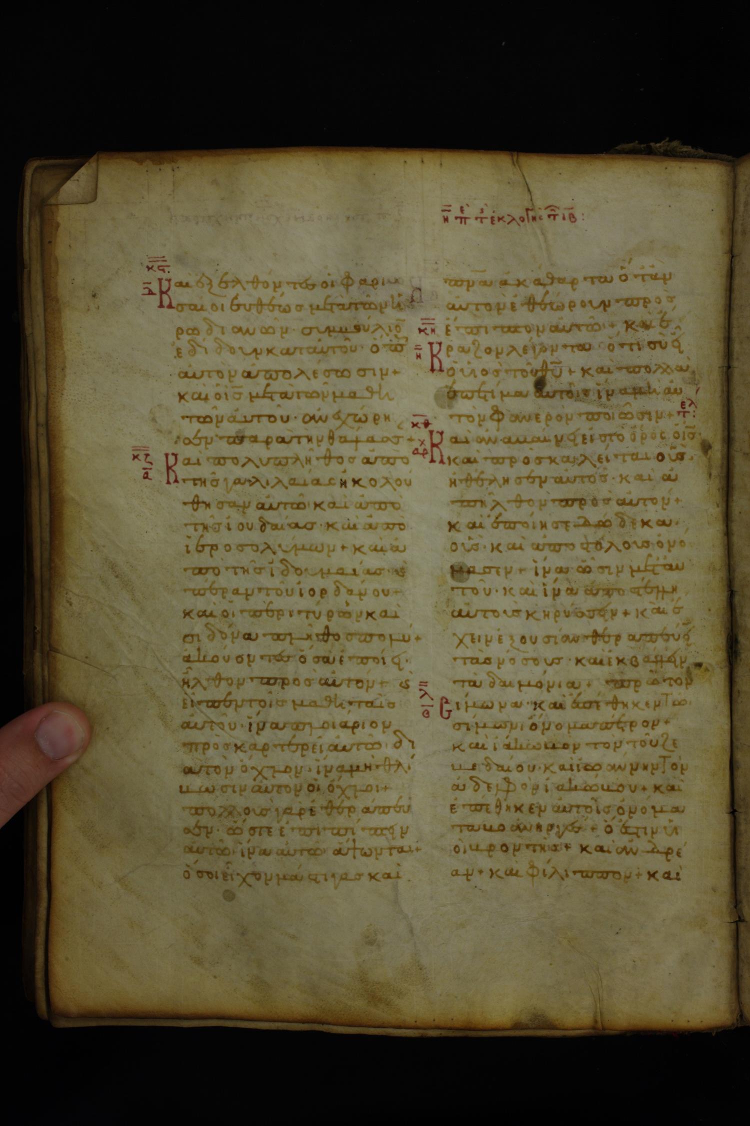 Twelfth century minuscule of the Gospels on parchment; 185 leaves, 2 columns, 26–30 lines per column.
