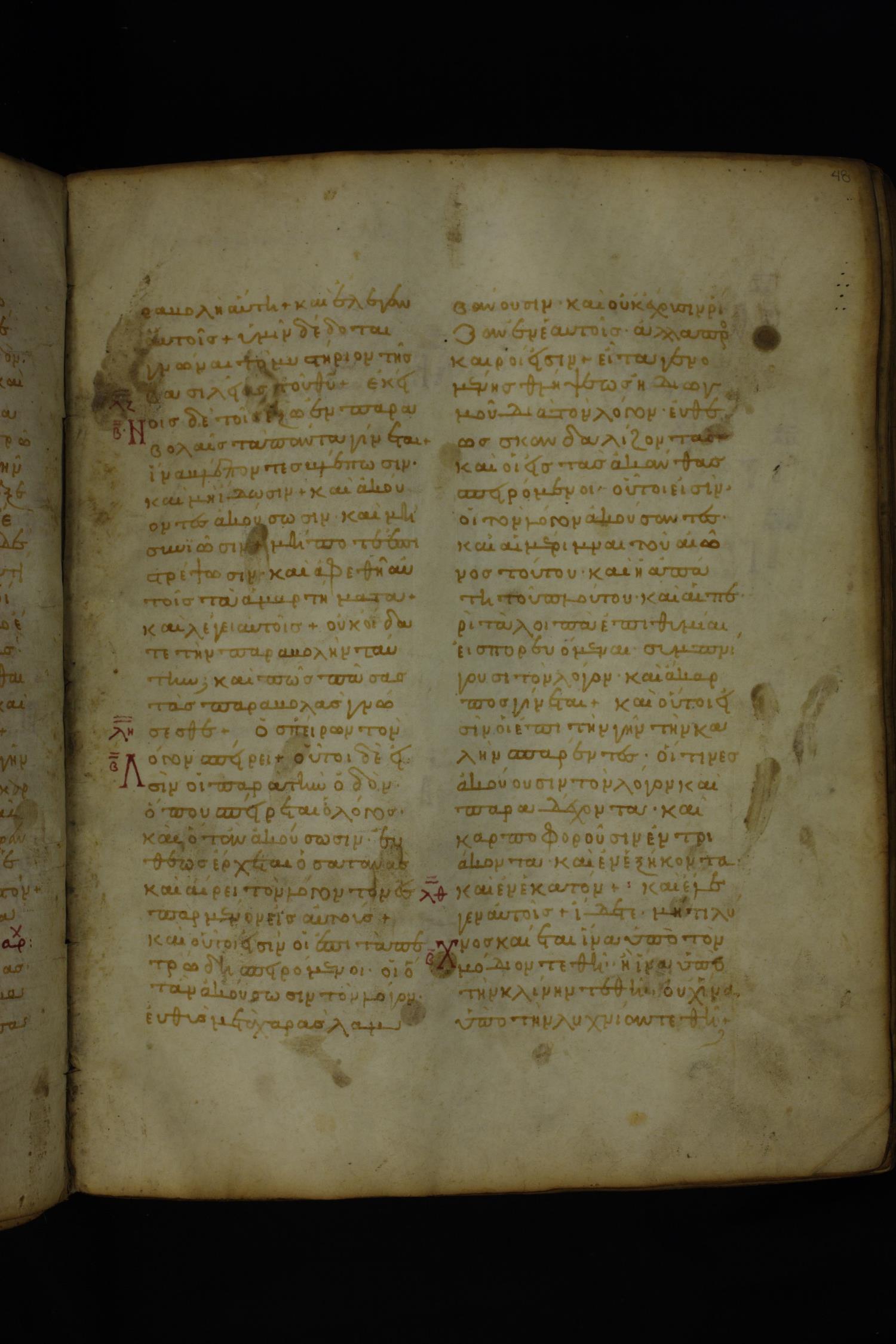 Twelfth century minuscule of the Gospels on parchment; 185 leaves, 2 columns, 26–30 lines per column.