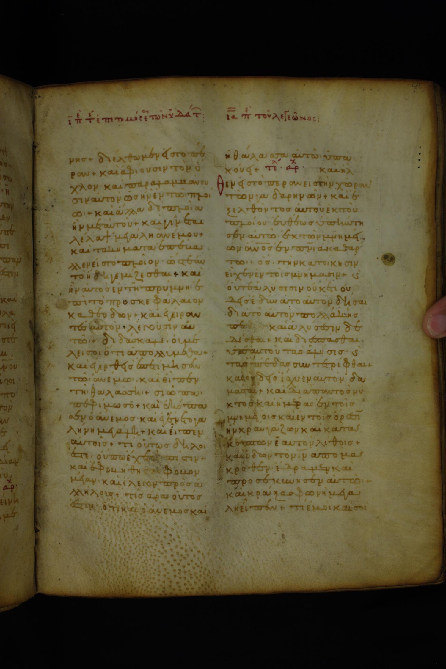 Twelfth century minuscule of the Gospels on parchment; 185 leaves, 2 columns, 26–30 lines per column.