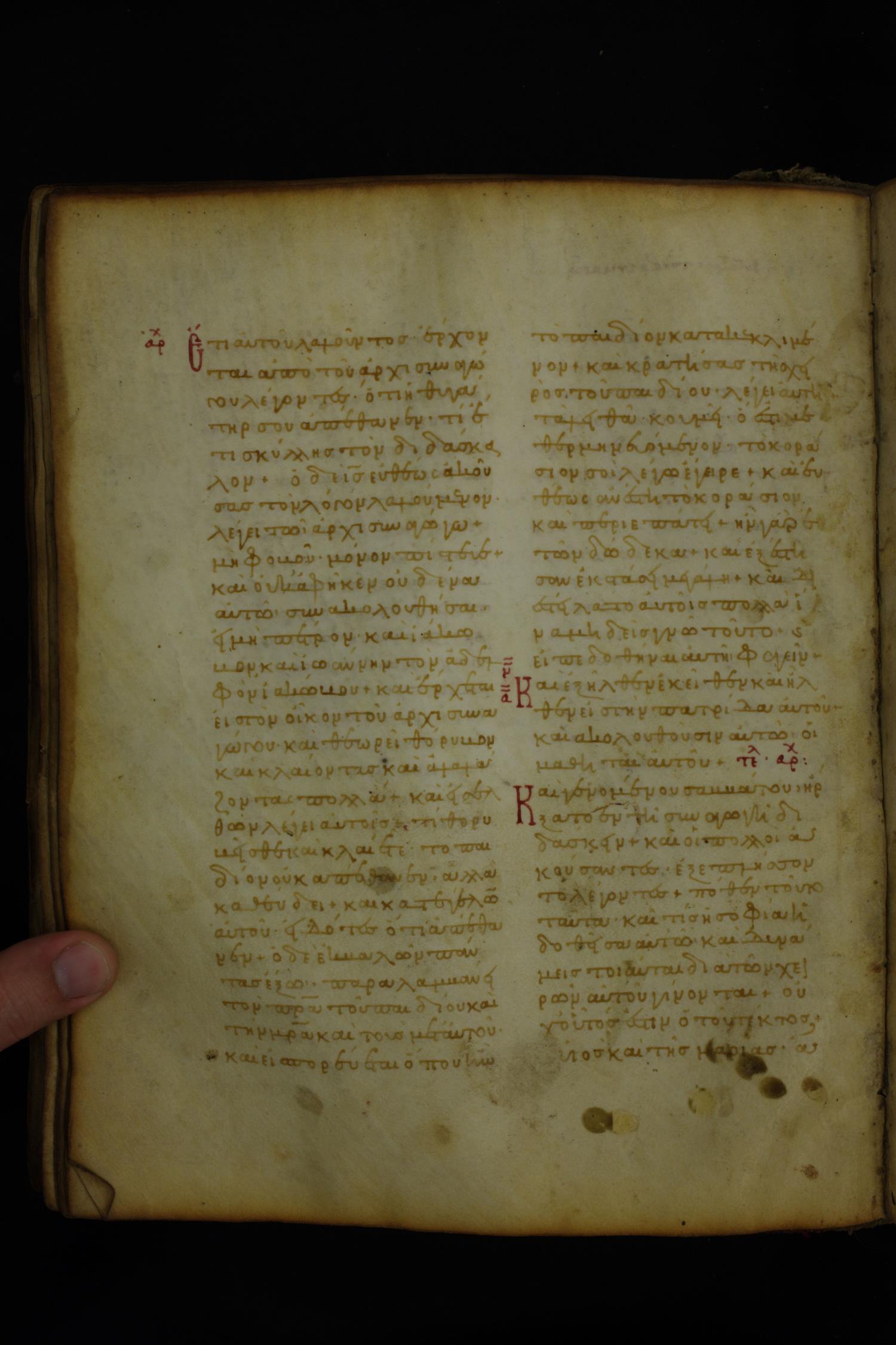 Twelfth century minuscule of the Gospels on parchment; 185 leaves, 2 columns, 26–30 lines per column.