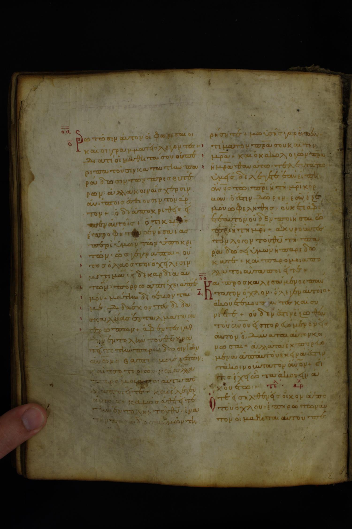Twelfth century minuscule of the Gospels on parchment; 185 leaves, 2 columns, 26–30 lines per column.